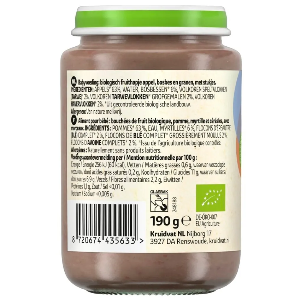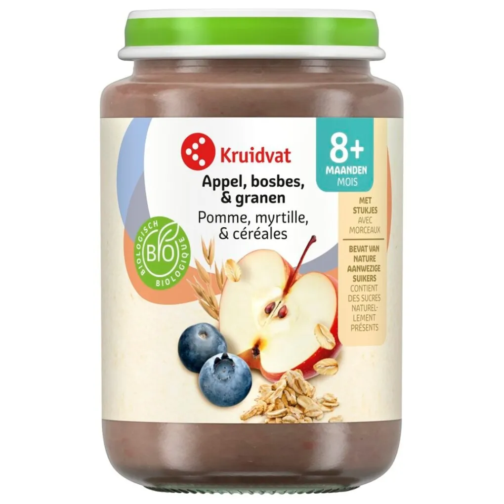 Laat je baby genieten van dit heerlijke Kruidvat 8+M Bio Appel, Bosbes & Granen Fruithapje. Het fruithapje is geschikt voor kindjes vanaf 8 maanden.