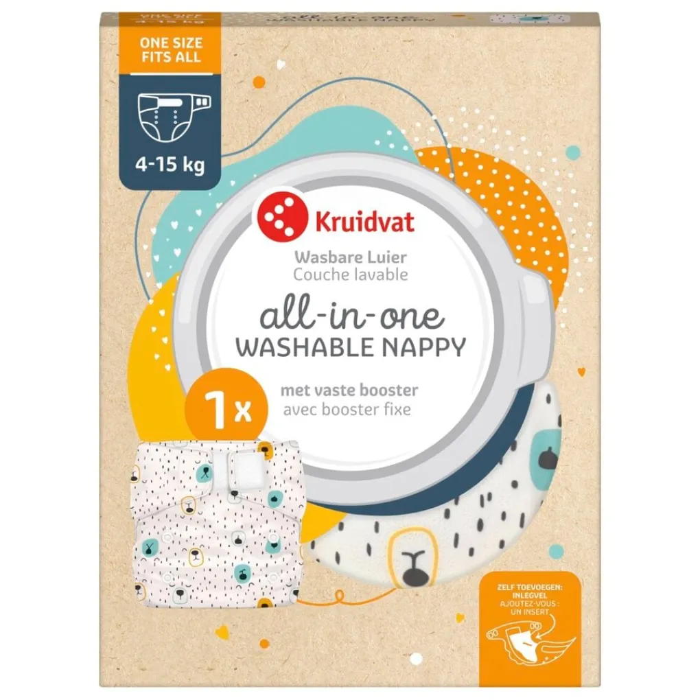 Was na was zorgt deze Kruidvat All-in-one Wasbare Luier, met vaste booster, ervoor dat vocht uit de buurt van je kindje blijft. Het enige dat je nog weggooit is het inlegvelletje.