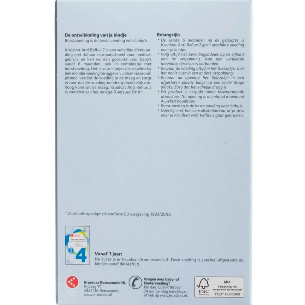 Kruidvat Anti Reflux 2 6-12M Dieetvoeding bij Spugen is een dieetvoeding met Johannesbroodpitmeel voor kindjes die regelmatig een mondje voeding teruggeven. Johannesbroodpitmeel verdikt de voeding in de maag en zorgt ervoor dat de voeding minder gemakkelijk omhoog komt uit de maag. In medische woorden noemt men dat vermindering van gastro-oesofageale reflux, kort gezegd anti-reflux.