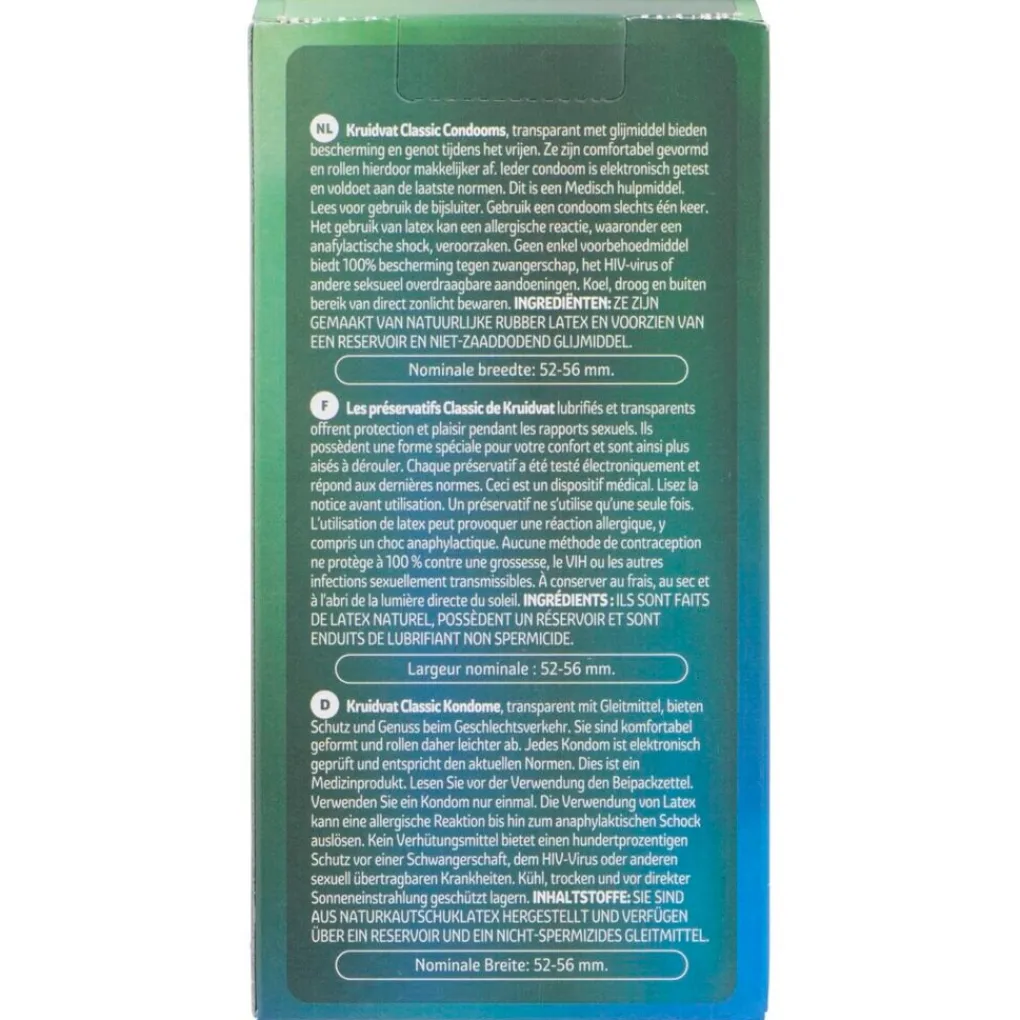 Voor extra comfort gebruik je Kruidvat Classic Condooms. Ze zijn speciaal voorgevormd en rollen gemakkelijk af. De condooms zijn gemaakt van natuurlijk rubber latex voorzien van een reservoir en niet-zaaddodend glijmiddel.