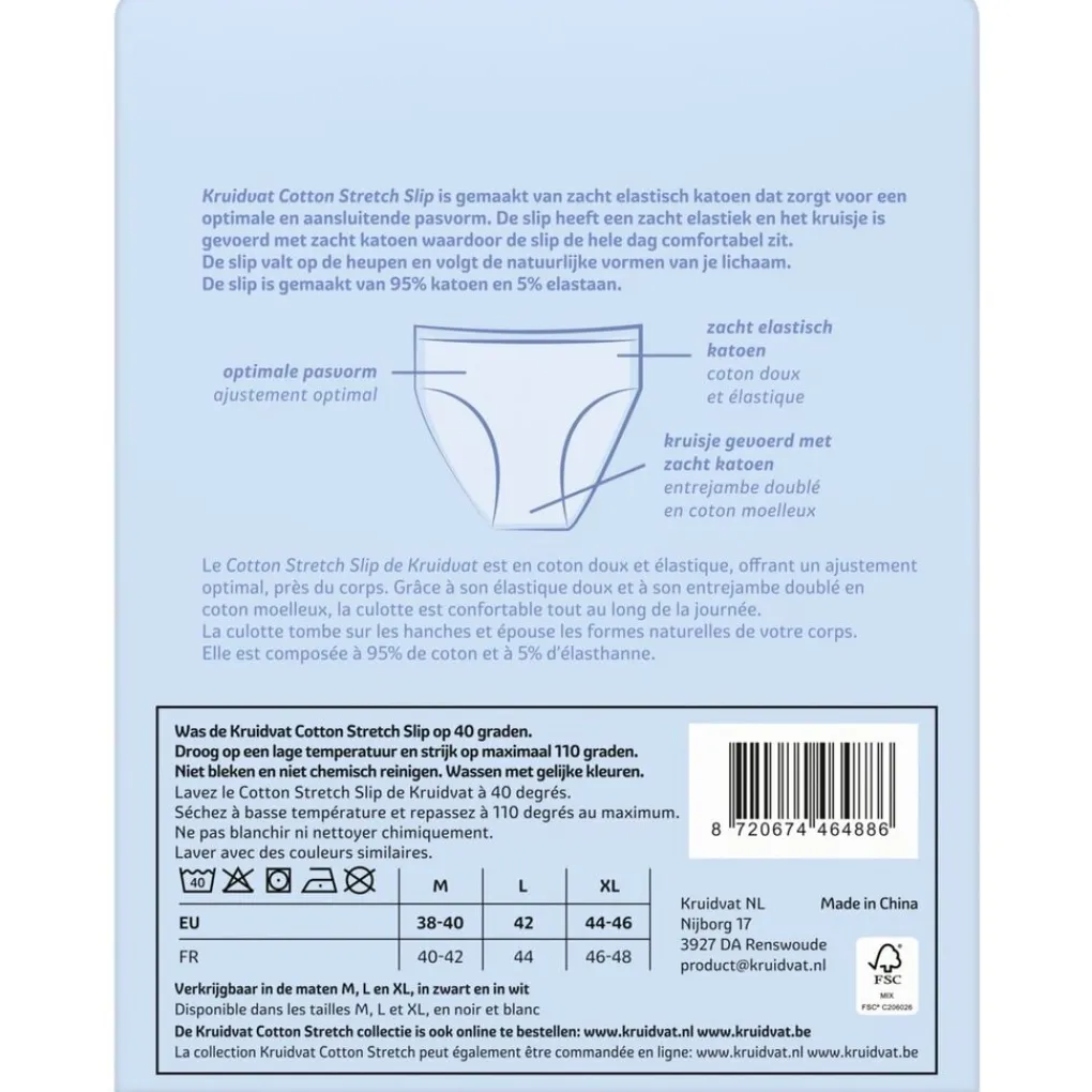 Was de Kruidvat Cotton Stretch Damesslip op maximaal 40 graden met gelijke kleuren. Droog op een lage temperatuur en strijk op maximaal 110 graden. Niet bleken en chemisch reinigen.