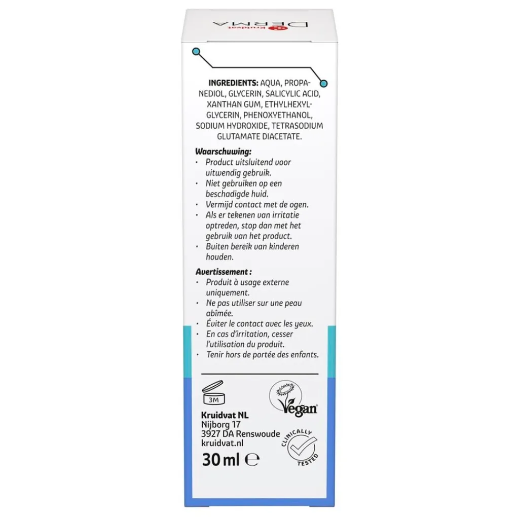 Kruidvat. DERMA.Zuiverend Serum. SALICYLIC ACID 2% A purifying serum for skin prone to imperfections. Exfoliates the skin surface and reduces impurities. Cleanses pores.30 ml