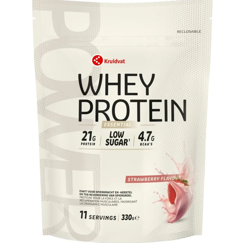 Kruidvat Essential Strawberry Whey Protein bevat alle essentiële aminozuren. Deze belangrijke voedingsstoffen worden niet door je lichaam aangemaakt en moet je door middel van je dagelijkse voeding binnenkrijgen. Verder is Kruidvat proteïnepoeder rijk aan eiwit en laag in suikergehalte (indien bereid met water).