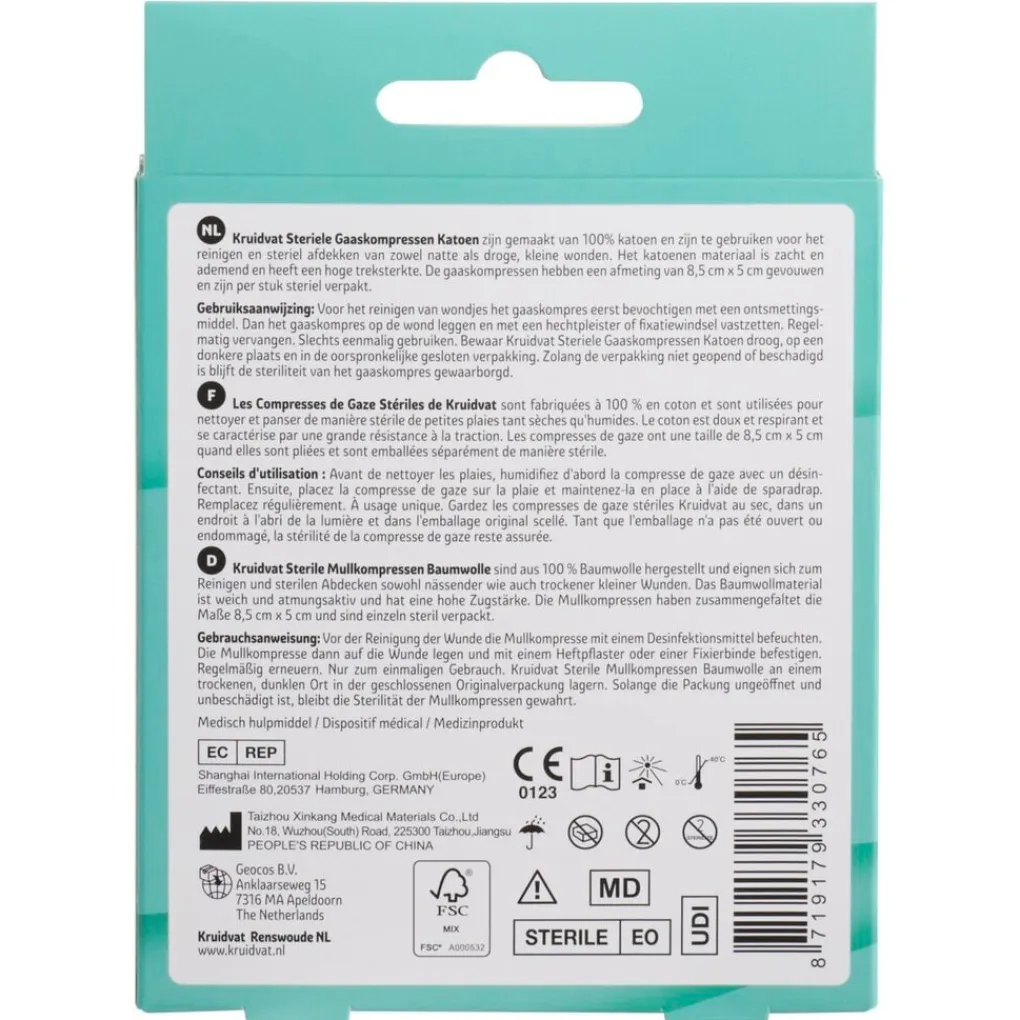 Bewaar de gaasjes koel, droog en schoon. Kruidvat Katoen Gaaskompressen zijn per stuk verpakt. Zolang de verpakking niet geopend of beschadigd is, blijft de steriliteit van het kompres gewaarborgd.