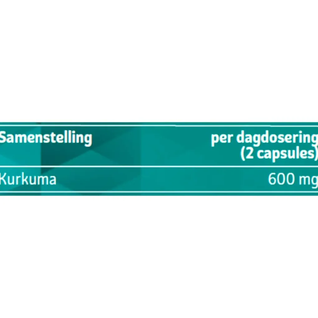 Ingrediënten: vulstoffen (calciumcarbonaat, microkristallijne cellulose), kurkuma (curcuma longa), gelatine (rund/varken), stabilisatoren (magnesiumzouten van vetzuren, siliciumdioxide), antiklontermiddel (tricalciumfosfaat).