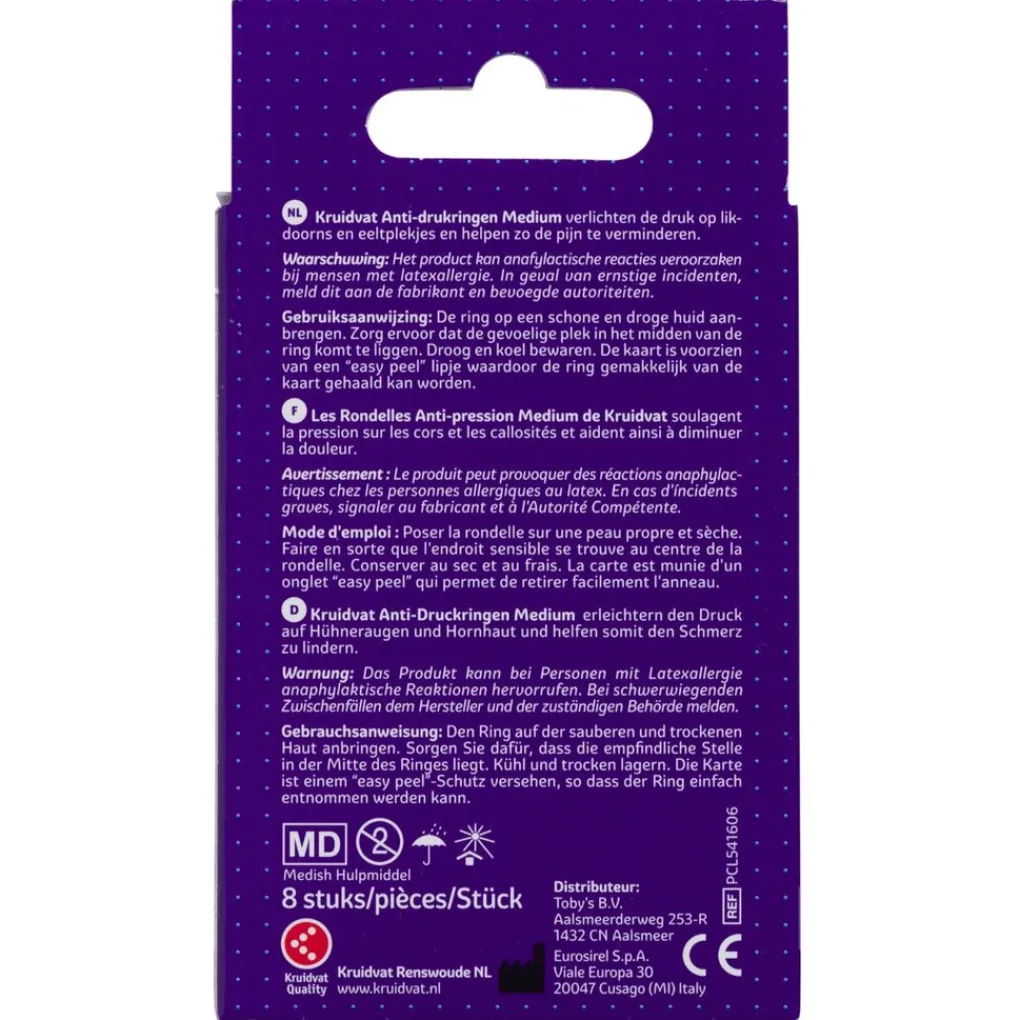Verlicht de druk op likdoorns en eeltplekjes met Kruidvat Medium Anti-Drukringen. De anti-drukringen helpen de pijn te verminderen. Ze hebben een verzachtende en beschermende werking.