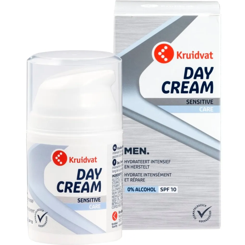 Hydrateert intensief en helpt de huid herstellen.Kruidvat Men Day Cream Sensitive Care voor de gevoelige huid hydrateert de huid intensief en langdurig zodat deze gedurende de dag niet trekt of branderig aanvoelt en er gezond uitziet.Deze dagcrème met UVA/UVB-filters (SPF15):• kalmeert de huid bij irritaties en roodheid• helpt de huid herstellen