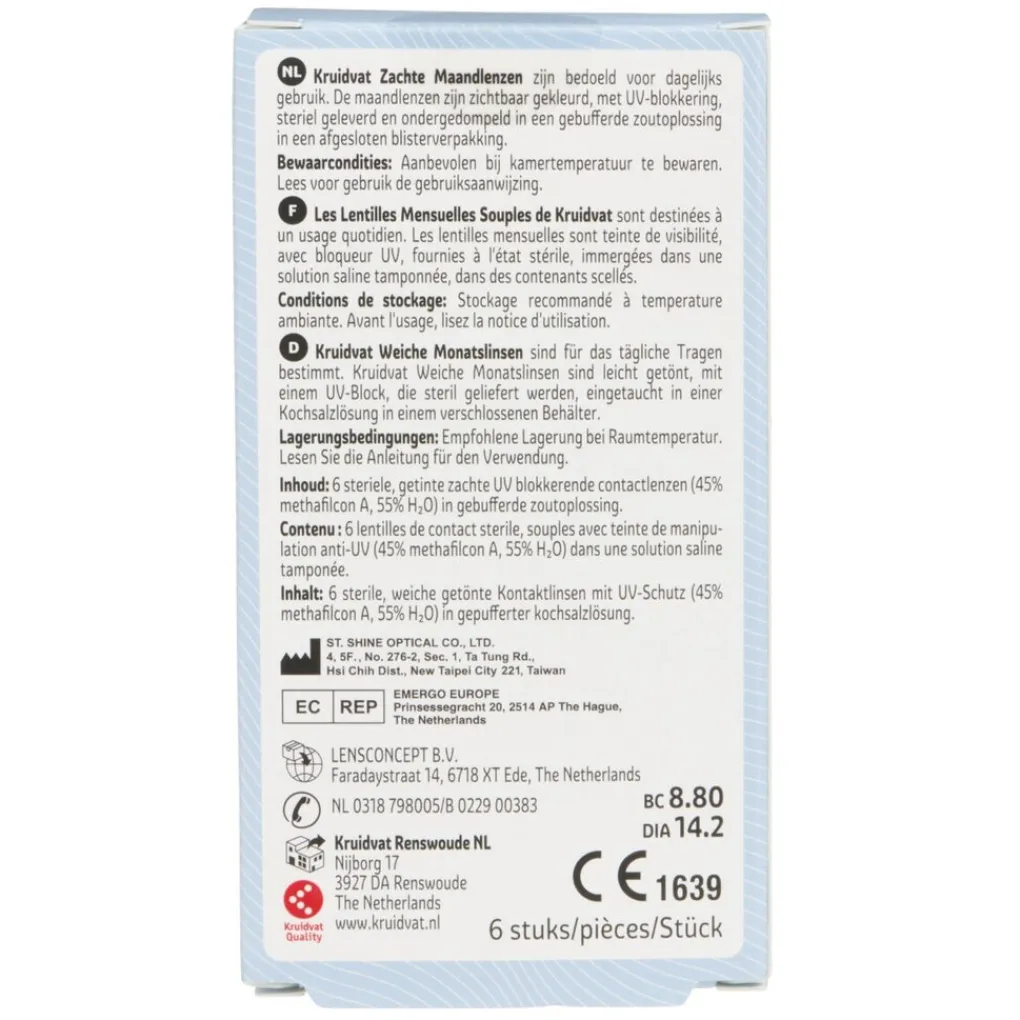 Kruidvat zachte maandlenzen zijn bedoeld voor dagelijks gebruik. De maandlenzen zijn zichtbaar gekleurd, met UV-blokkering, steriel geleverd en ondergedompeld in een gebufferde zoutoplossing in een afgesloten blisterverpakking.