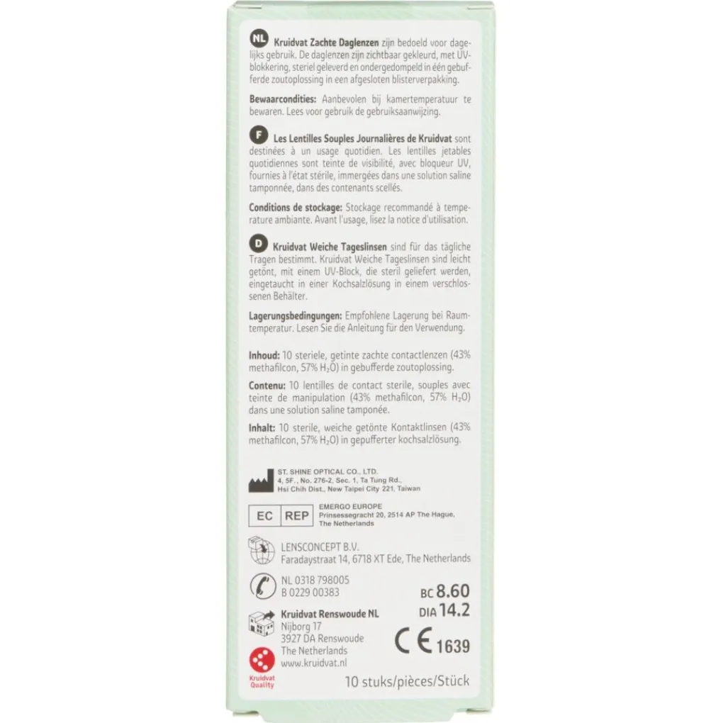 Kruidvat zachte daglenzen zijn bedoeld voor dagelijks gebruik. De daglenzen zijn zichtbaar gekleurd, met UV-blokkering, steriel geleverd en ondergedompeld in één gebufferde zoutoplossing in een afgesloten blisterverpakking.