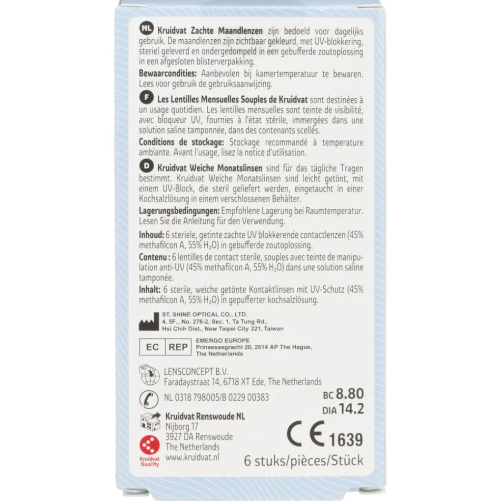 Kruidvat zachte maandlenzen zijn bedoeld voor dagelijks gebruik. De maandlenzen zijn zichtbaar gekleurd, met UV-blokkering, steriel geleverd en ondergedompeld in een gebufferde zoutoplossing in een afgesloten blisterverpakking.