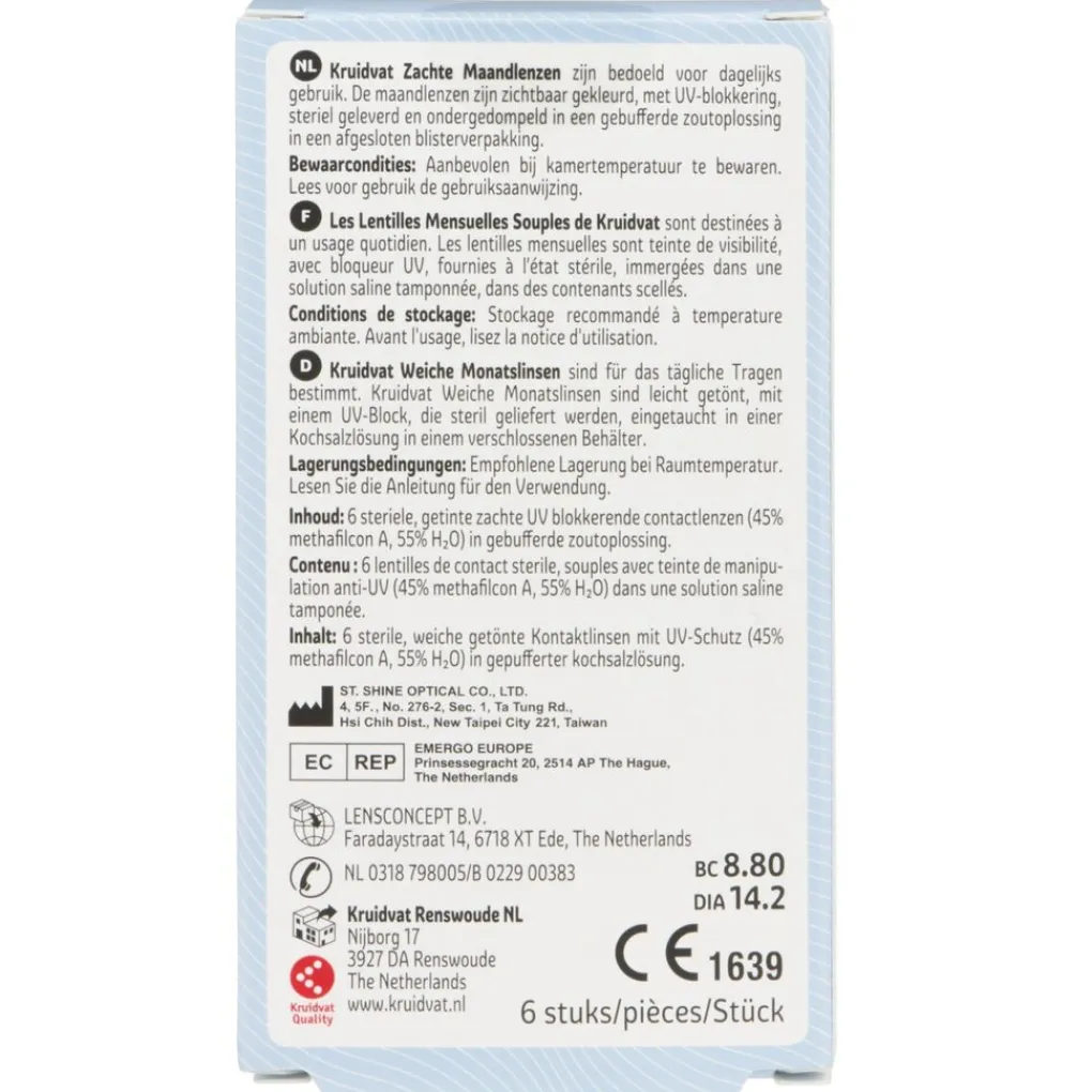 Kruidvat zachte maandlenzen zijn bedoeld voor dagelijks gebruik. De maandlenzen zijn zichtbaar gekleurd, met UV-blokkering, steriel geleverd en ondergedompeld in een gebufferde zoutoplossing in een afgesloten blisterverpakking.