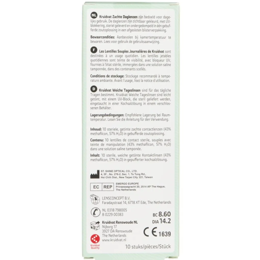 Kruidvat zachte daglenzen zijn bedoeld voor dagelijks gebruik. De daglenzen zijn zichtbaar gekleurd, met UV-blokkering, steriel geleverd en ondergedompeld in één gebufferde zoutoplossing in een afgesloten blisterverpakking.