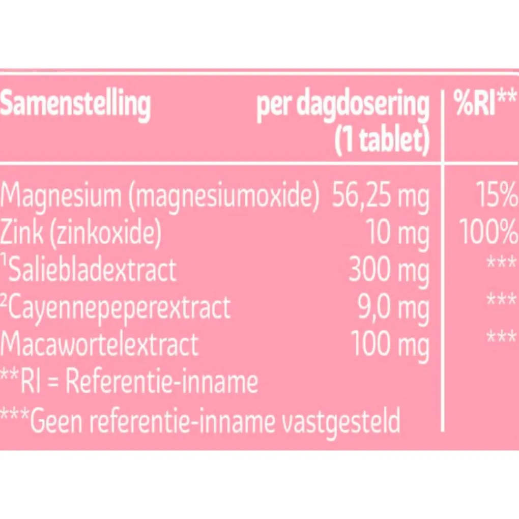 Ingrediënten: saliebladextract (salvia officinalis l.), vulstoffen (sorbitol, hydroxypropylcellulose), mineralen, macawortelexxtract (lepidium meyenii walp.), maiszetmeel, antiklontermiddel (vetzuren), cayennepeperextract (capsicum annuum L.).