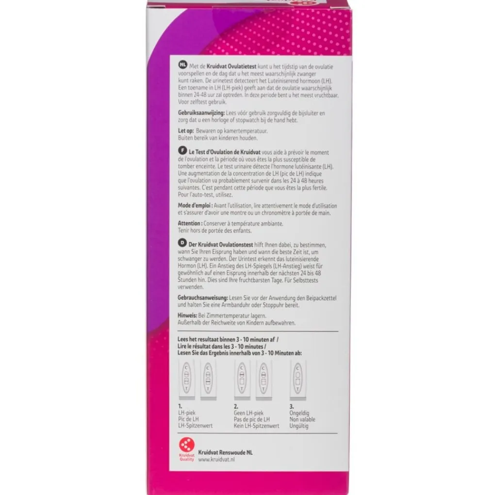 De Kruidvat Ovulatietest meet met een betrouwbaarheid van meer dan 99% de hormoonstijging (LH) in de urine.
