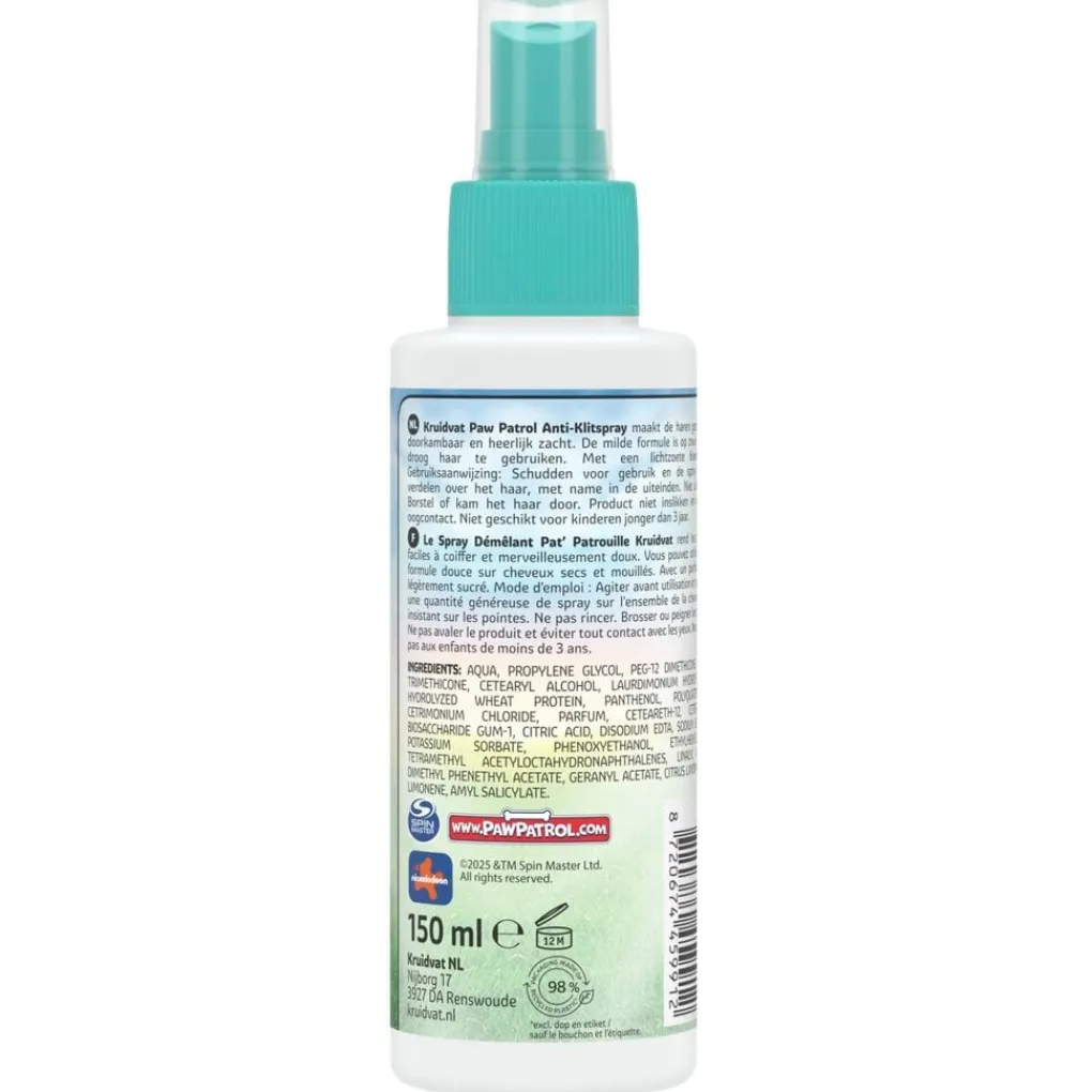 Geen tranen, wel avontuur! Kruidvat Paw Patrol Anti-Klitspray maakt haartjes gemakkelijk doorkambaar en heerlijk zacht. De milde formule is geschikt voor zowel nat als droog haar en heeft een heerlijke lichtzoete bloemengeur.