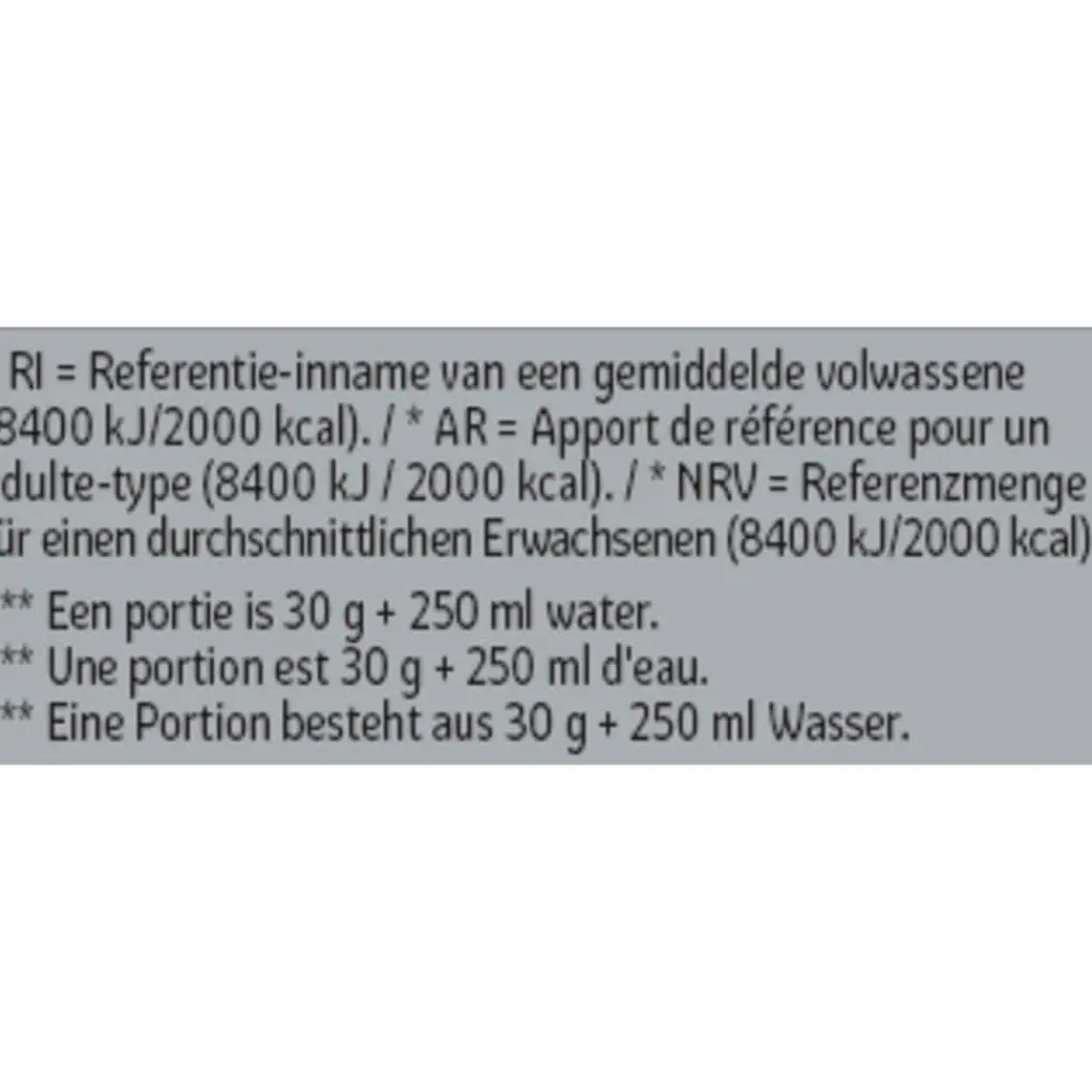 Samenstelling:# Voedingswaardevermelding per;100 g poeder; ; ;portie***; ; ;%RI*per portie***# Energie;1613 kJ /;382 kcal;484 kJ/;115 kcal;6%# Vetten;6,0;g;1,8;g;2%# waarvan verzadigde vetzuren;3,2;g;1,0;g;5%# Koolhydraten;6,9;g;2,1;g;1%# waarvan suikers;5,2;g;1,6;g;2%# Vezels;4,3;g;1,3;g;-# Eiwitten;72;g;22;g;44%# Zout;0,55;g;0,16;g;3%# * RI = Referentie-innamevan een gemiddelde volwassene(8400 kJ/2000 kcal).# *** Een portie is 30 g +250 ml water.# Aminozuren per;100 g poeder;; ;portie***; ; # Cystine;1,3;g;0,4;g# Methionine**;1,5;g;0,5;g# Histidine**;1,2;g;0,4;g# Isoleucine(BCAA)**;4,3;g;1,3;g# Leucine(BCAA)**;7,2;g;2,2;g# Lysine**;6,5;g;1,9;g# Fenylalanine**;2,2;g;0,7;g# Tyrosine;2,1;g;0,6;g# Threonine**;4,9;g;1,5;g# Valine (BCAA)**;4,0;g;1,2;g# Arginine;1,7;g;0,5;g# Alanine;3,4;g;1,0;g# Asparaginezuur;7,2;g;2,2;g# Glutaminezuur;12,1;g;3,6;g# Proline;4,2;g;1,3;g# Serine;3,7;g;1,1;g# Glycine;1,3;g;0,4;g# Totaal aminozuren;68,8;g;20,8;g# Totaal BCAAs;15,5;g;4,7;g