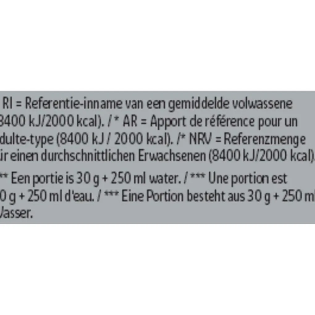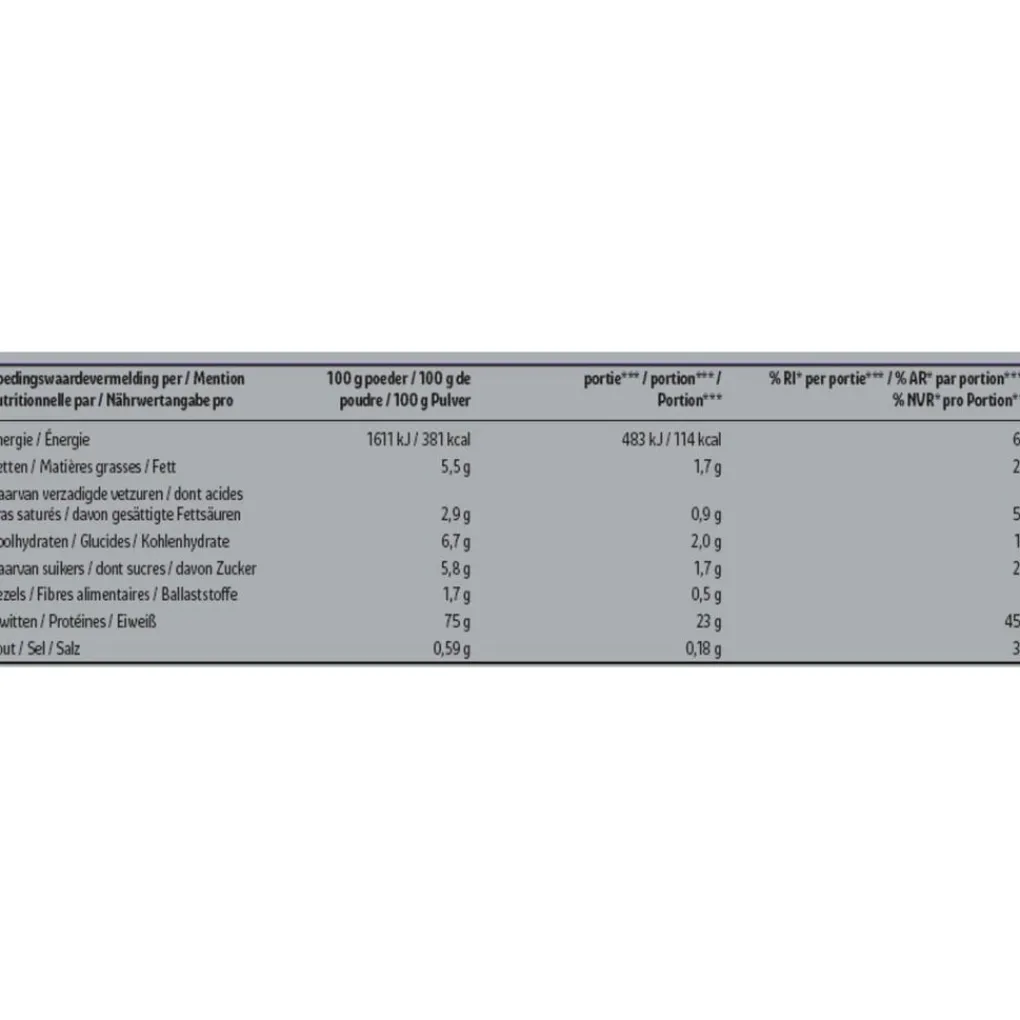 Voedingswaardevermelding per;100 g poeder;; ;portie***; ; ;%RI*per portie***# Energie;1611kJ / 381 kcal;483 kJ / 114 kcal;6%# Vetten;5,5g;1,7;g;2%# waarvan verzadigde vetzuren;2,9;g;0,9;g;5%#Koolhydraten;6,7;g;2,0;g;1%# waarvan suikers;5,8;g;1,7;g;2%# Vezels;1,7;g;0,5;g;-#Eiwitten;75;g;23;g;45%#Zout;0,59;g;0,18;g;3%# * RI = Referentie-inname van een gemiddelde volwassene(8400 kJ/2000 kcal).# *** Een portie is 30 g +250 ml water.# Aminozuren per;100 g poeder;; ;portie***; ; # Cystine;1,4g;0,4g#Methionine**;1,7g;0,5g# Histidine**;1,4g;0,4g#Isoleucine (BCAA)**;4,7g;1,4g# Leucine(BCAA)**;7,9g;2,4g# Lysine**;7,0g;2,1g#Fenylalanine**;2,5g;0,7g# Tyrosine;2,2g;0,7g#Threonine**;5,4g;1,6g# Valine(BCAA)**;4,4g;1,3g# Arginine;1,8g;0,6g#Alanine;3,7g;1,1g#Asparaginezuur;7,9g;2,4g#Glutaminezuur;13,1g;3,9g# Proline;4,6g;1,4g#Serine;4,1g;1,2g# Glycine;1,4g;0,4g# Totaalaminozuren;75,2g;22,5g# TotalBCAAs;17,0g;5,1g
