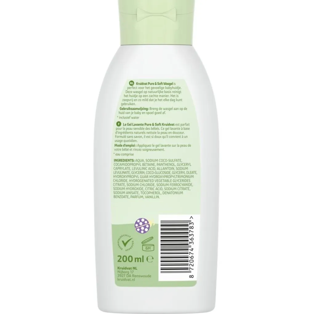 Kruidvat Pure & Soft Wasgel is perfect voor het gevoelige babyhuidje. Deze wasgel op natuurlijke basis reinigt het huidje op een zachte manier.