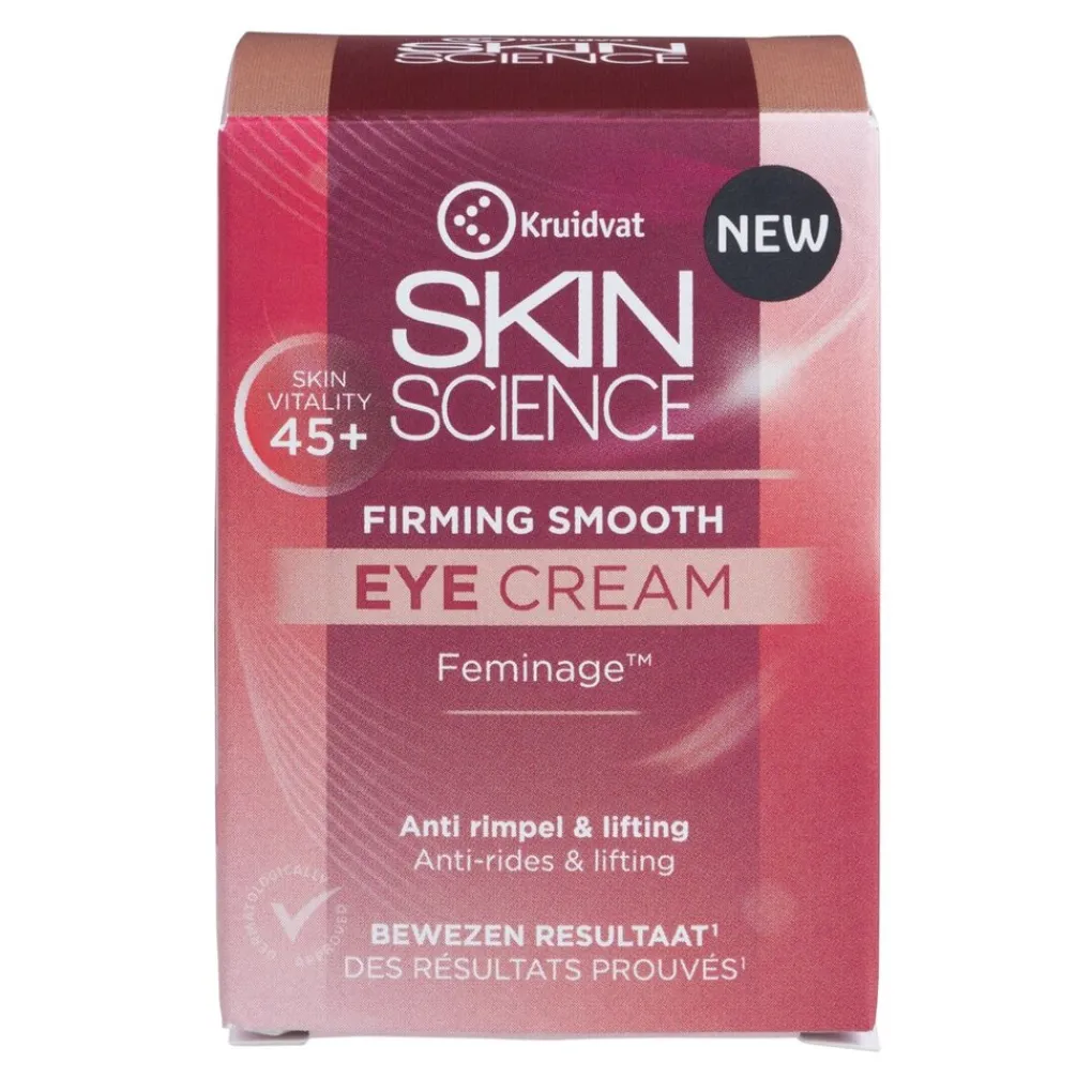 Kruidvat Skin Science Firming Smooth 45+ Eye Cream met cafeïne en ogentroost geeft de huid rond je ogen verlichting voor een frisse blik met een uitgeruste uitstraling. De oogcrème is ongeparfumeerd en oftalmologisch goedgekeurd.