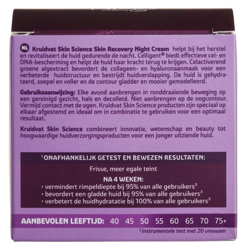Kruidvat Skin Science Skin Recovery 55+ Night Cream helpt je huid herstellen en revitaliseren gedurende de nacht. De crème bevat celligent, wat effectieve cel- en DNA-bescherming biedt en helpt je huid haar kracht terug te krijgen.