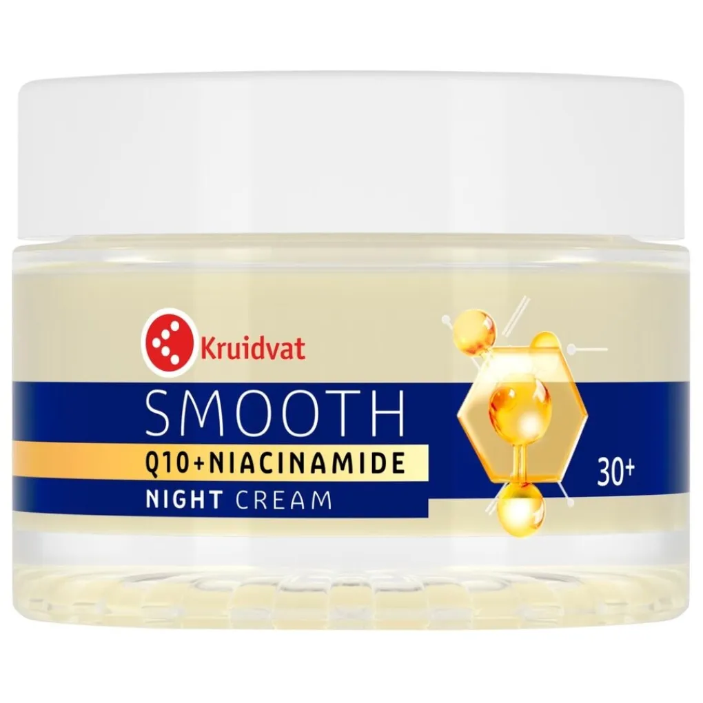 Kruidvat Smooth Q10 + Niacinamide Nachtcrème hydrateert, vermindert fijne lijntjes en rimpels en boost je collageen.