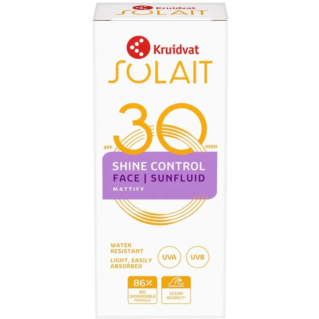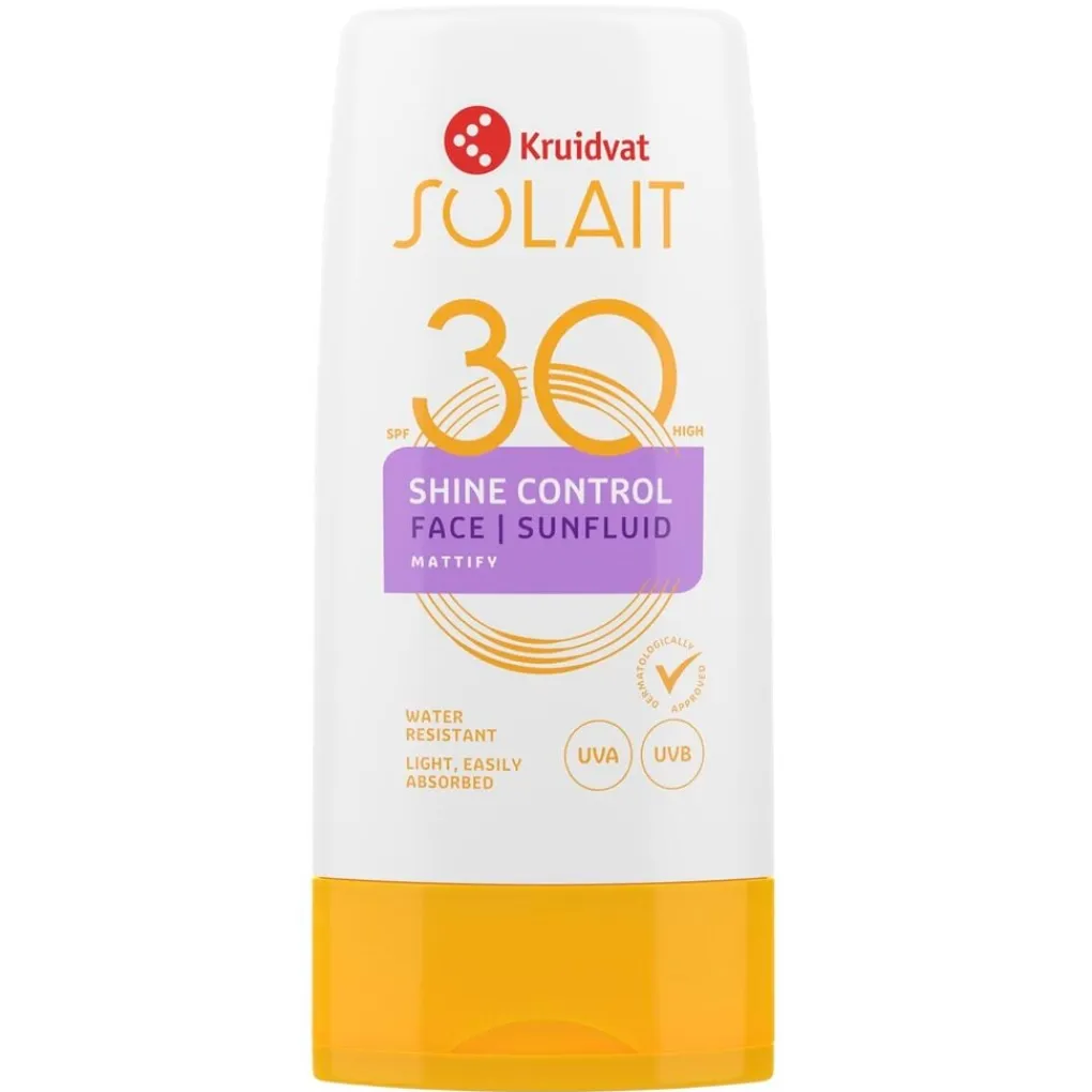 Kruidvat Solait SPF30 Face Sunfluid biedt een hoge bescherming voor je gezicht, hals en decolleté. De combinatie van uv A- en B-filters geeft direct bescherming.