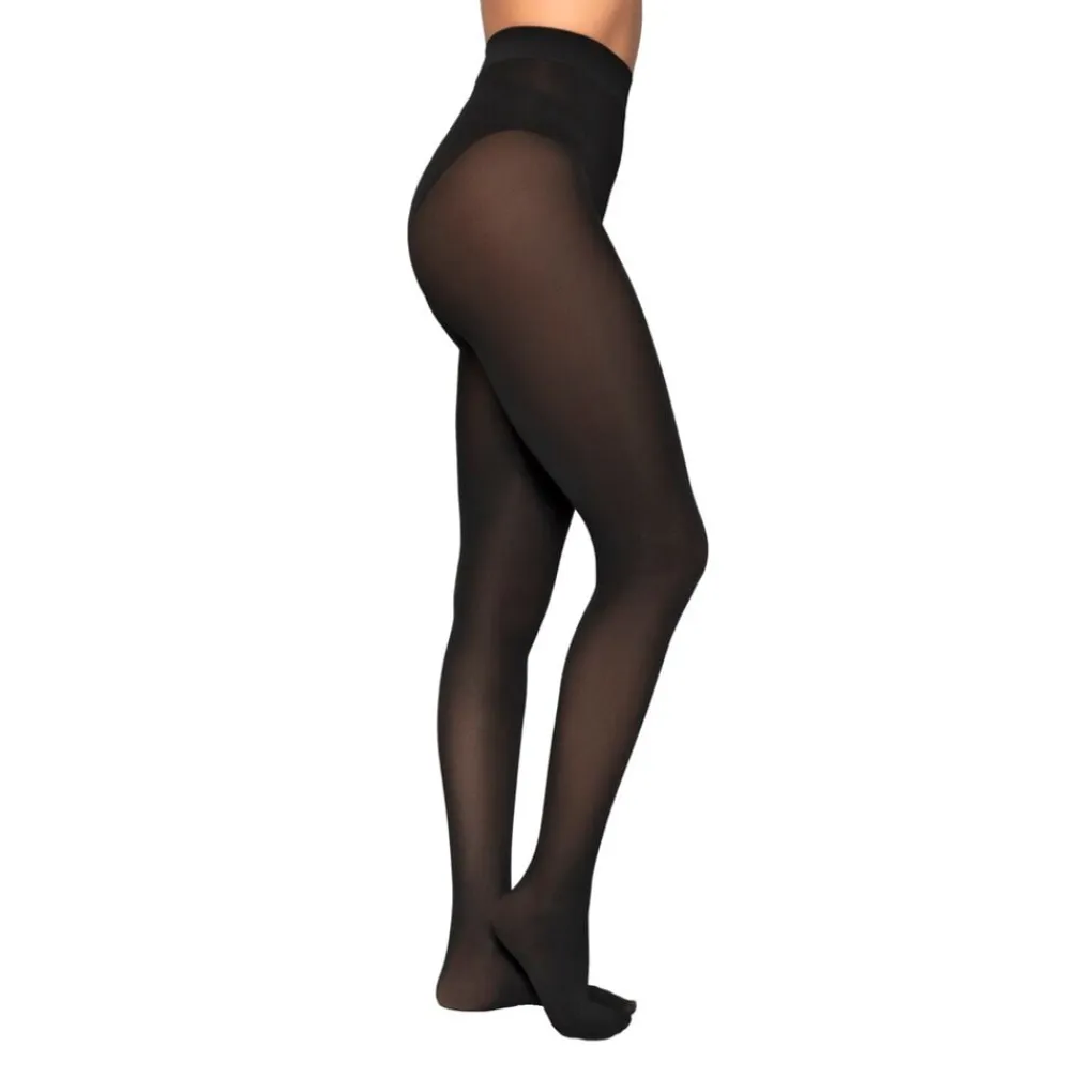 De zwarte panty is gemaakt van niet doorschijnende matterende garens. Hij is daarnaast verstevigd met Lycra-vezel voor een uitstekende pasvorm.