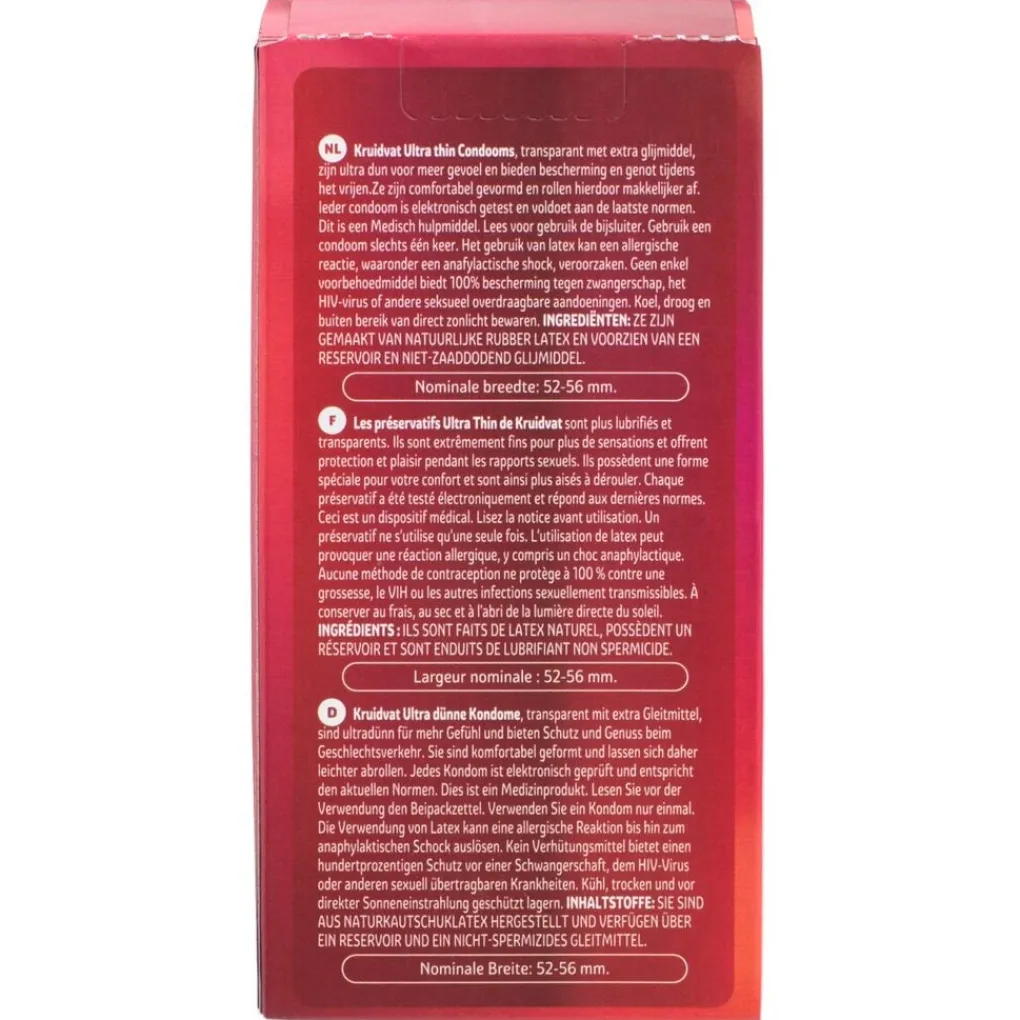Voor meer gevoel en genot tijdens het vrijen gebruik je Kruidvat Ultra Thin Condooms. De condooms zijn ultradun, bieden veiligheid en zijn speciaal gevormd voor extra comfort. Ze rollen hierdoor gemakkelijk af.