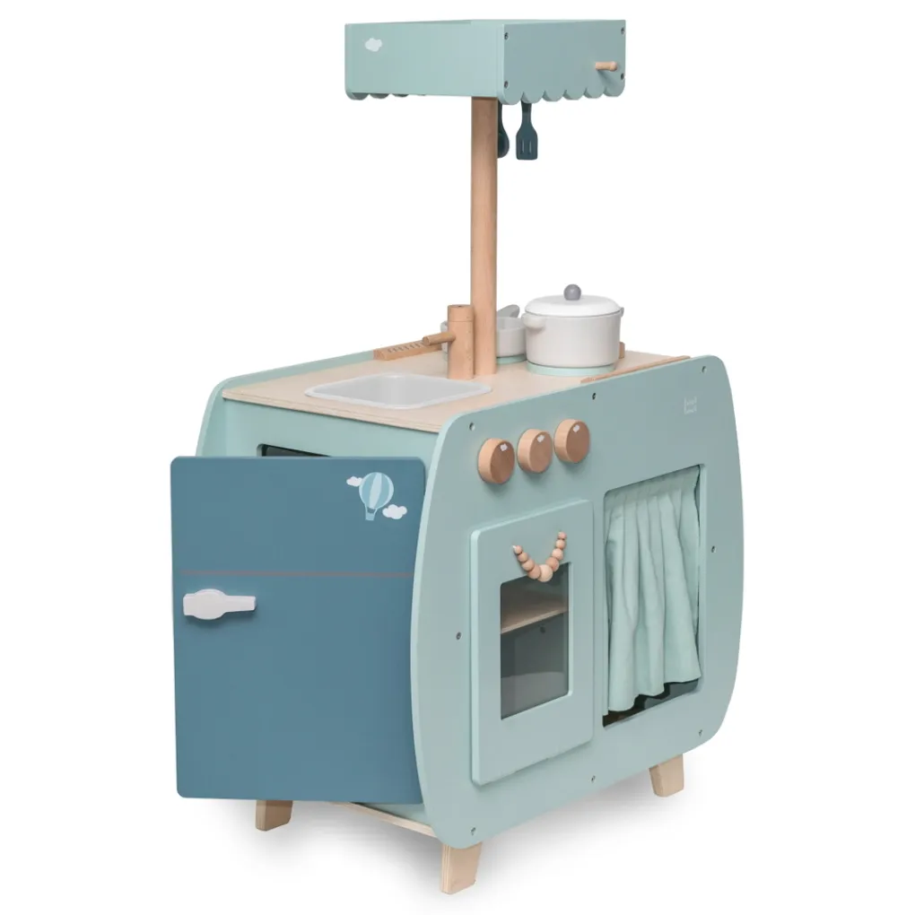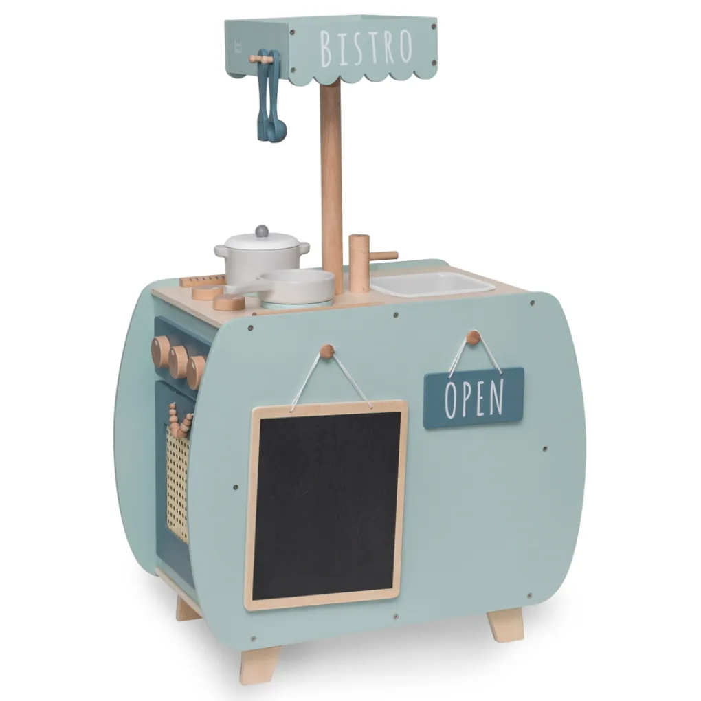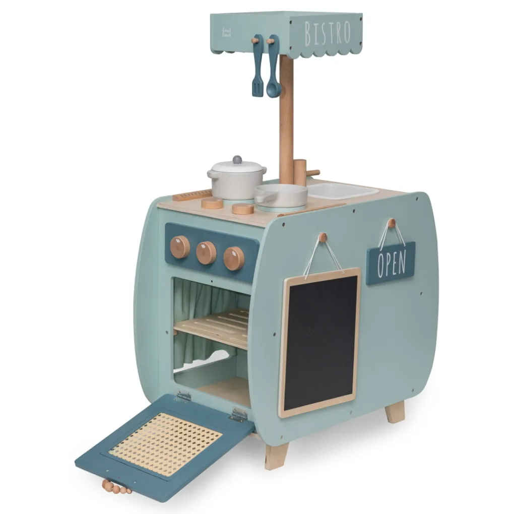 Doordat het kookeiland is voorzien van verschillende schattige details zoals de knoppen van het gasfornuis en de leuke handvaten, lijkt het net een echte grote mensen keuken. Daarnaast kunnen ook alle deurtjes geopend worden. Omdat je kindje rond om de keuken kan lopen, kan hij of zij ook samen met een vriendje of vriendinnetje de sterren van de hemel koken. De keuken heeft aan alle kanten wat te beleven en heeft de afmetingen 60 x 34,5 x 51/89 cm. De totale hoogte van de keuken is 89 cm, de hoogte van het werkblad is 51 cm hoog. Het bistro keukentje is geschikt voor kinderen vanaf 3 jaar.