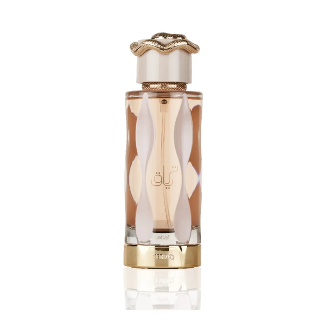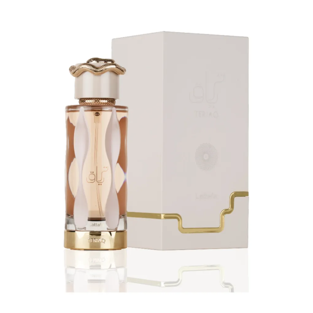 Teriaq is een betoverende oosterse geur die de zintuigen prikkelt met zijn harmonieuze mix van zoete en bloemige tonen met karamel, amandel, abrikoos, honing, witte bloemen, vanille en labdanum.