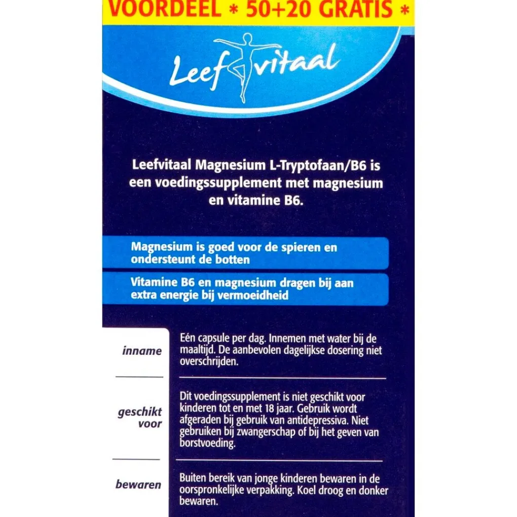 Leefvitaal Magnesium L-Tryptofaan/B6 Capsules bevatten magnesium en vitamine B6. Dit voedingssupplement ondersteunt de spieren en botten en draagt bij aan extra energie bij vermoeidheid.