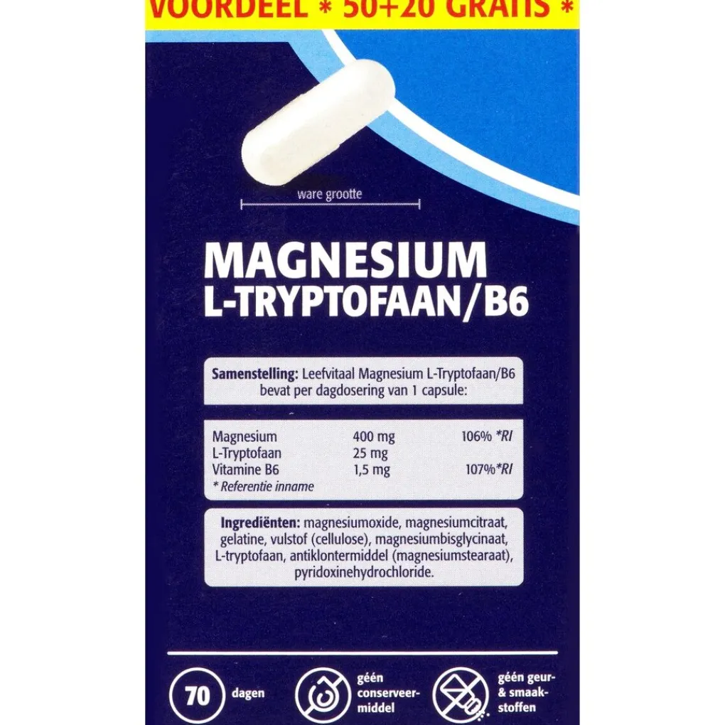 Leefvitaal Magnesium L-Tryptofaan/B6 bevat per dagdosering van 1 capsule: