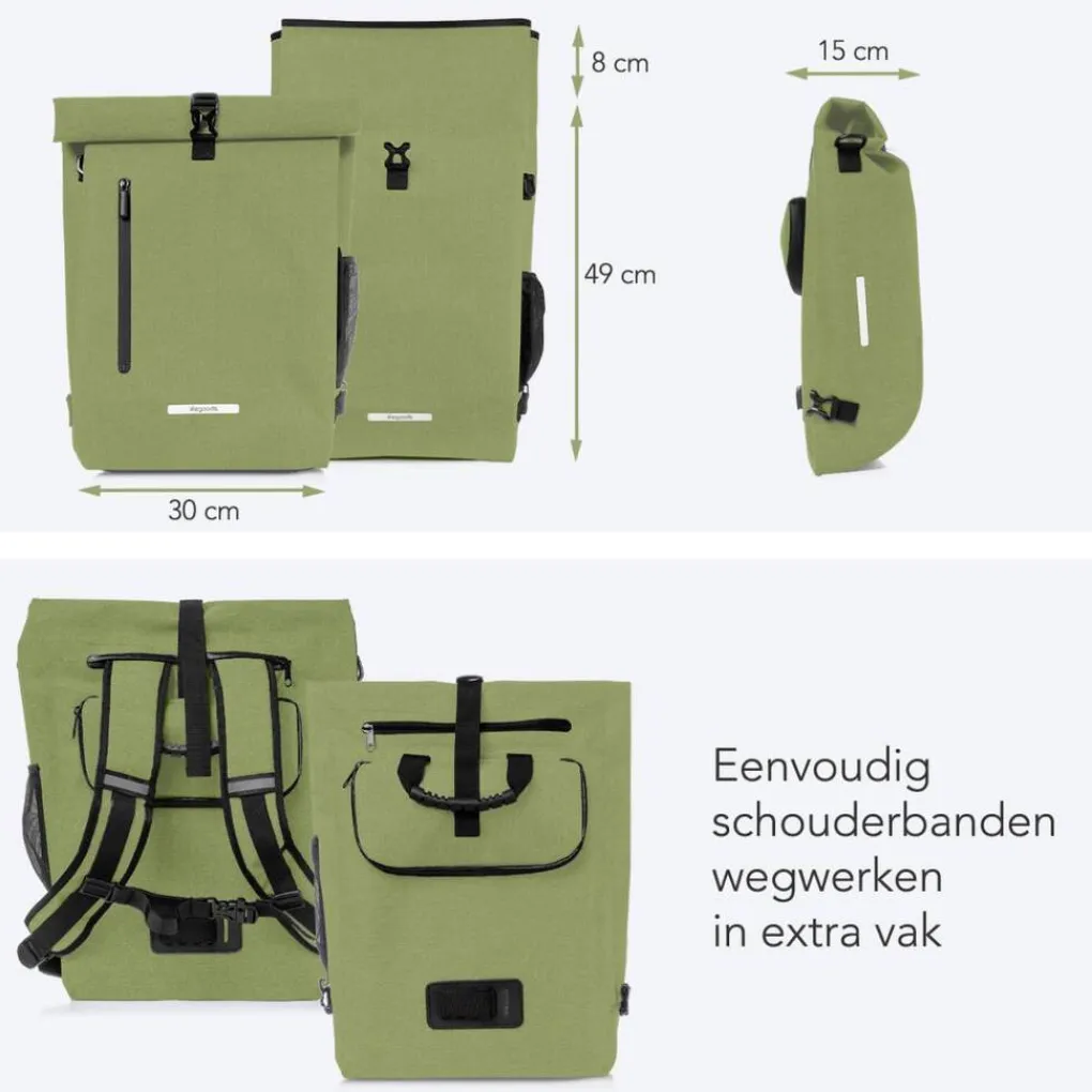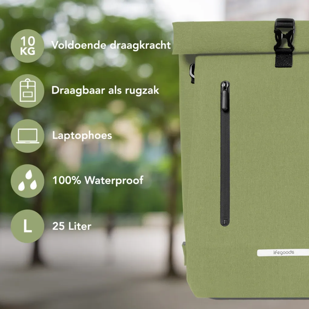 Fietstas, rugtas en schoudertas Ontspannen fietsen en lekker genieten van de landschappen? Stop je lunch en water in de LifeGoods Fietstas en je fietstocht kan beginnen. Daarnaast is de fietstas ook te gebruiken als rugtas en schoudertas. Perfect om mee naar werk te nemen! Gearriveerd op werk? Haal de schouderbanden uit de tas en je kan de tas op je rug of aan je schouder meenemen.