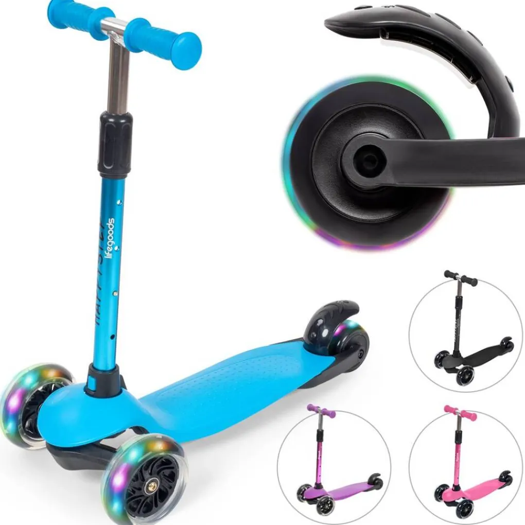 LED-lichtgevende wielen De HappyStep heeft een stevig aluminium frame en 3 wielen gemaakt van PU-materiaal (85A met ABEC 5 lagers). Doordat de step twee voorwielen en een achterwiel heeft is hij extra stabiel. Zo kan je kind makkelijk zijn/haar balans bewaren tijdens het steppen. Ook zijn deze wielen uitgerust met LED-verlichting; zodra de wielen draaien geven ze een vrolijke lichtshow. Dit maakt de step niet alleen heel leuk, maar ook goed zichtbaar voor jou en voor anderen.
