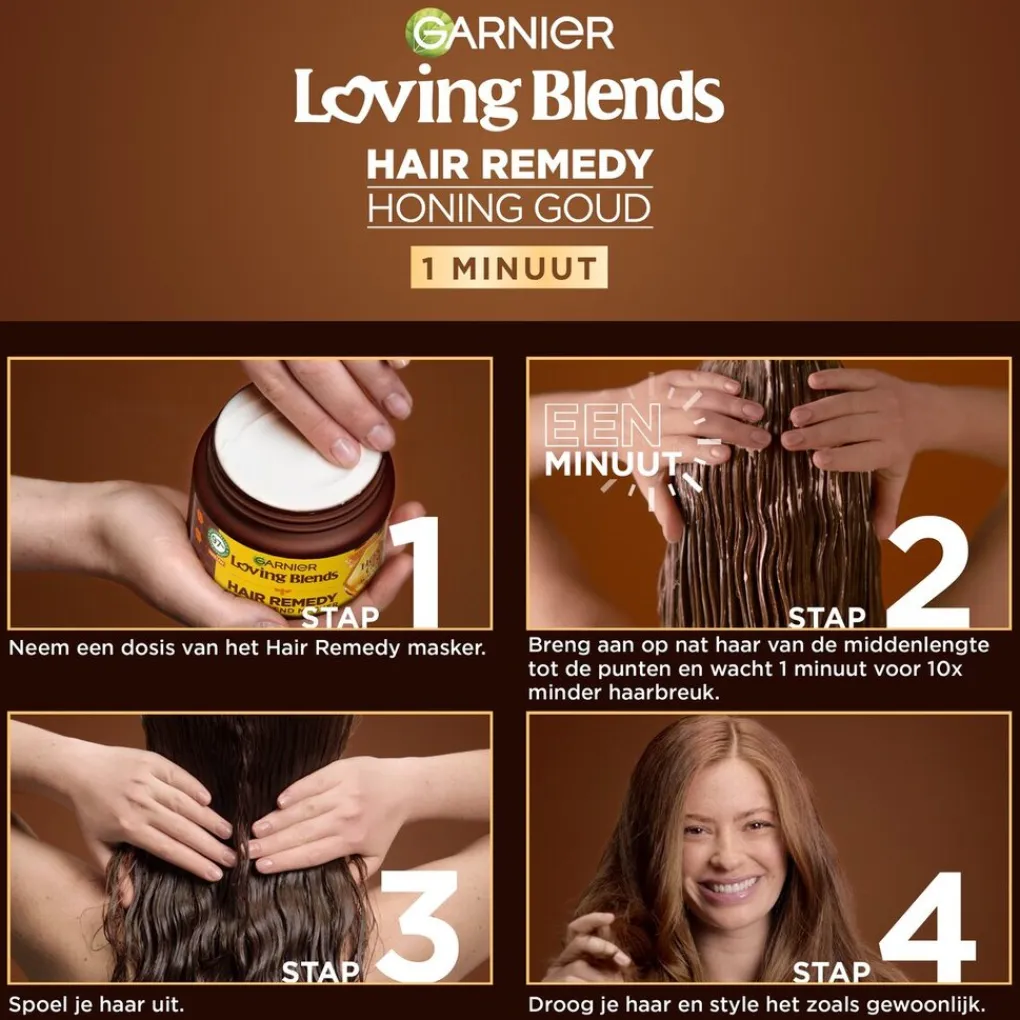 Garnier Loving Blends Hair Remedy Honing Goud Herstellend Haarmasker is speciaal ontwikkeld voor beschadigd en breekbaar haar. Het zorgt binnen één minuut voor tien keer minder haarbreuk en twee keer minder gespleten haarpunten.