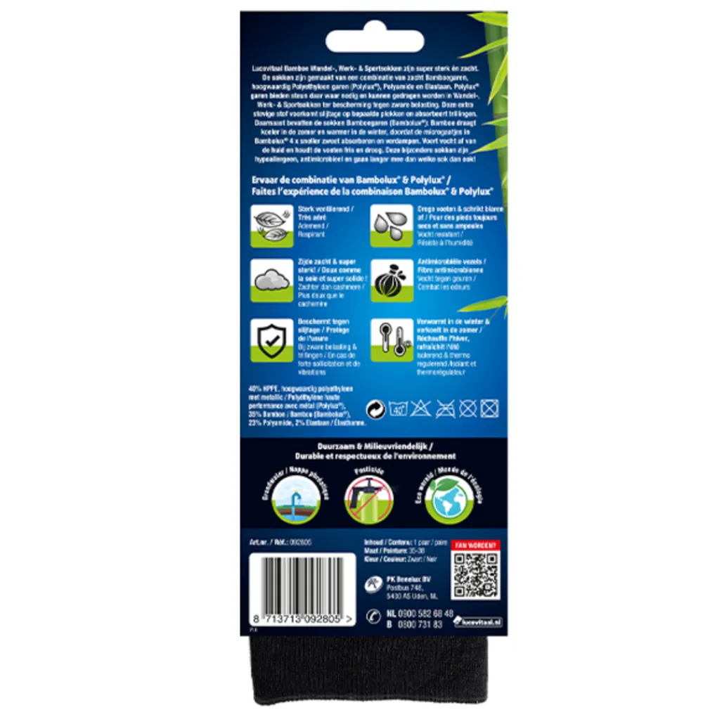Lucovitaal Bamboe Wandel-, Werk- & Sportsokken zijn super sterk én zacht. De sokken zijn gemaakt van een combinatie van zacht Bamboegaren, hoogwaardig Polyethyleen garen (Polylux®), Plyamide en Elastaan. Polylux® garen bieden steun daar waar nodig en kunnen gedragen worden in Wandel-, Werk- & Sportsokken ter bescherming tegen zware belasting. Deze extra stevige stof voorkomt slijtage op bepaalde plekken en absorbeert trillingen. Daarnaast bevatten de sokken Bamboegaren (Bambolux®): Bamboe draagt koeler in de zomer en warmer in de winter, doordat de microgaatjes in Bambolux® 4 x sneller zweet absorberen en verdampen. Voert vocht af van de huid en houdt de voeten fris en droog. Deze bijzondere sokken zijn hypoallergeen, antimicrobieel en gaan langer mee dan welke sok dan ook!