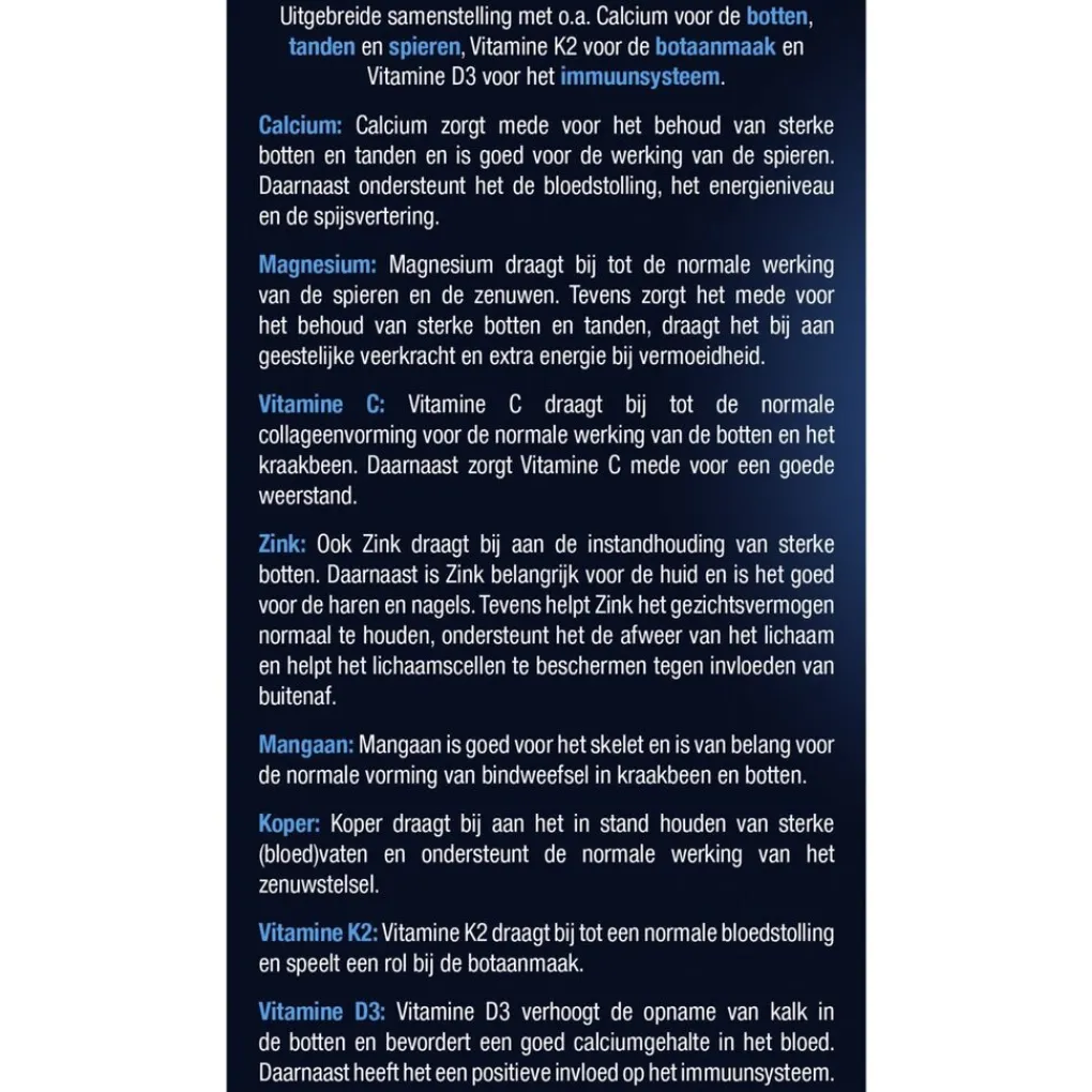 Calcium ondersteunt het behoud van sterkebotten en tanden en is goed voor de werkingvan de spieren. Ook ondersteunt Calcium debloedstolling, het energieniveau en despijsvertering. Magnesium draagt bij tot denormale werking van de spieren en dezenuwen. Tevens zorgt het mede voor hetbehoud van sterke botten en tanden, draagthet bij aan geestelijke veerkracht en extraenergie bij vermoeidheid. Vitamine C draagtbij tot de normale collageenvorming voor denormale werking van de botten en hetkraakbeen. Daarnaast zorgt Vitamine C medevoor een goede weerstand. Ook Zink draagtbij aan de instandhouding van sterke botten.Daarnaast is Zink belangrijk voor de huid en ishet goed voor de haren en nagels. Tevenshelpt Zink het gezichtsvermogen normaal tehouden, ondersteunt het de afweer van hetlichaam. Mangaan is goed voor het skelet enis goed voor de normale vorming van bindweefsel in kraakbeen en botten. Koperdraagt bij aan het in stand houden van sterke(bloed)vaten en ondersteunt de normalewerking van het zenuwstelsel. Vitamine K2draagt bij tot een normale bloedstolling enspeelt een rol bij de botaanmaak. Vitamine D3verhoogt de opname van kalk in de botten enbevordert een goed calciumgehalte in hetbloed. Daarnaast is vitamine D ook goed voorhet immuunsysteem. Bevat geen zout. Geensuikers toegevoegd.
