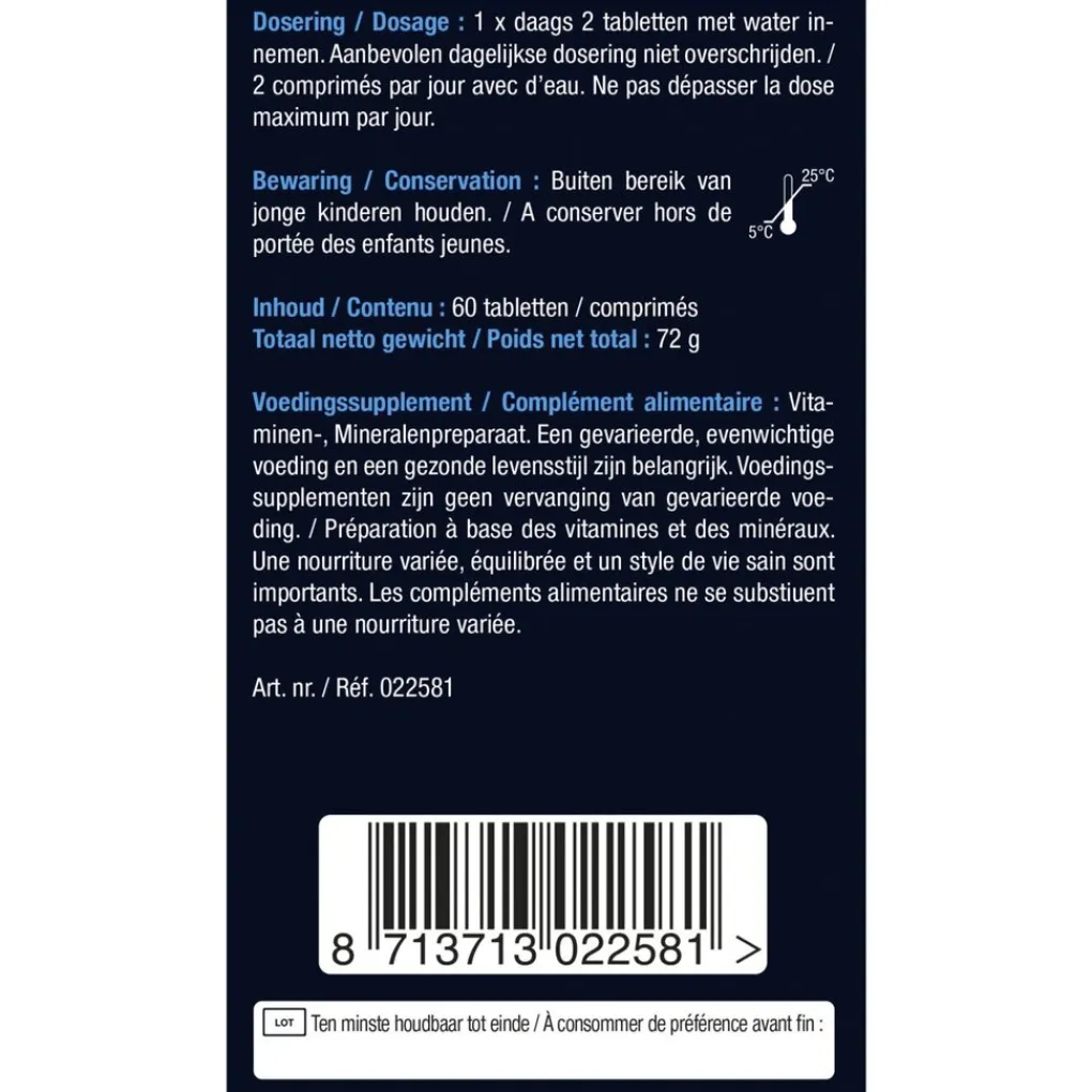 Vitaminen-, Mineralenpreparaat. Een gevarieerde, evenwichtige voeding en een gezonde levensstijl zijn belangrijk. Voedingssupplementen zijn geen vervanging van gevarieerde voeding.