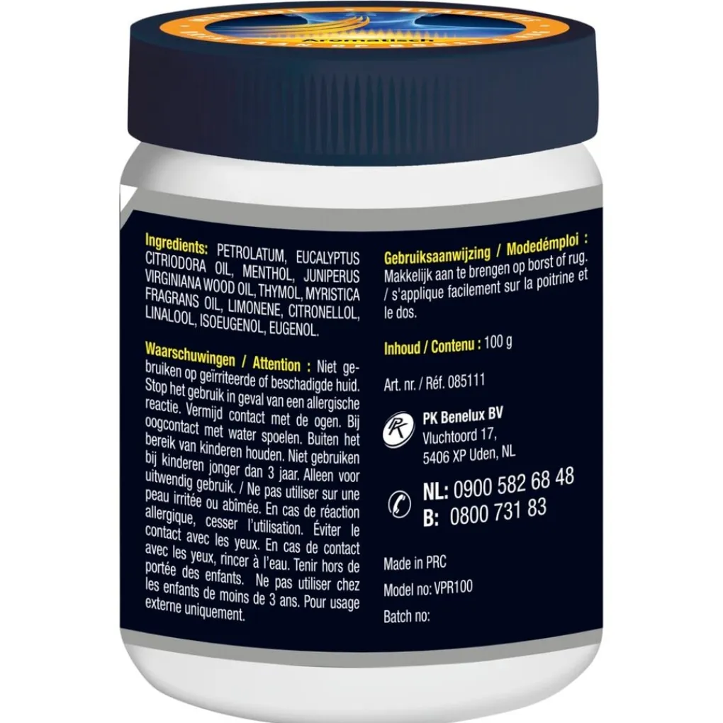 Ingrediënten: PETROLATUM, EUCALYPTUS CITRIODORA OIL, MENTHOL, JUNIPERUS VIRGINIANA WOOD OIL, THYMOL, MYRISTICA FRAGRANS OIL, LIMONENE, CITRONELLOL, LINALOOL, ISOEUGENOL, EUGENOL.