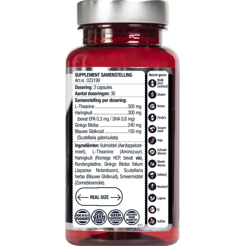 Ingrediënten: : Vulmiddel (Aardappelzetmeel), L-Theanine (Aminozuur), Haringkuit (Romega HCP, bevat VIS), Capsuleomhulsel (Rundergelatine), Ginkgo Biloba folium (Japanse Notenboom), Scutellaria herba (Blauwe Glidkruid), Emulgatoren (Zonnebloemolie/Siliciumdioxide).
