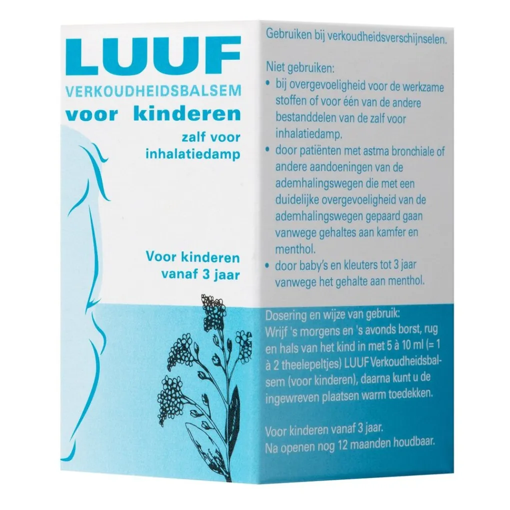 LUUF Verkoudheidsbalsem is een zalf voor inhalatiedamp, voor kinderen vanaf 3 jaar. Voor uitwendig gebruik.