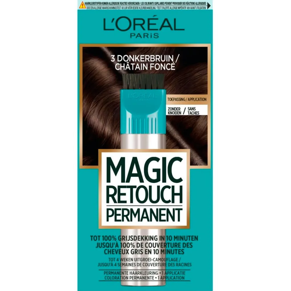 L’Oréal Paris Magic Retouch 3 Donkerbruin Permanente Haarkleuring biedt een snelle oplossing tussen haarkleuringen. Binnen tien minuten dekt deze permanente haarkleuring tot 100% van je grijze haren.