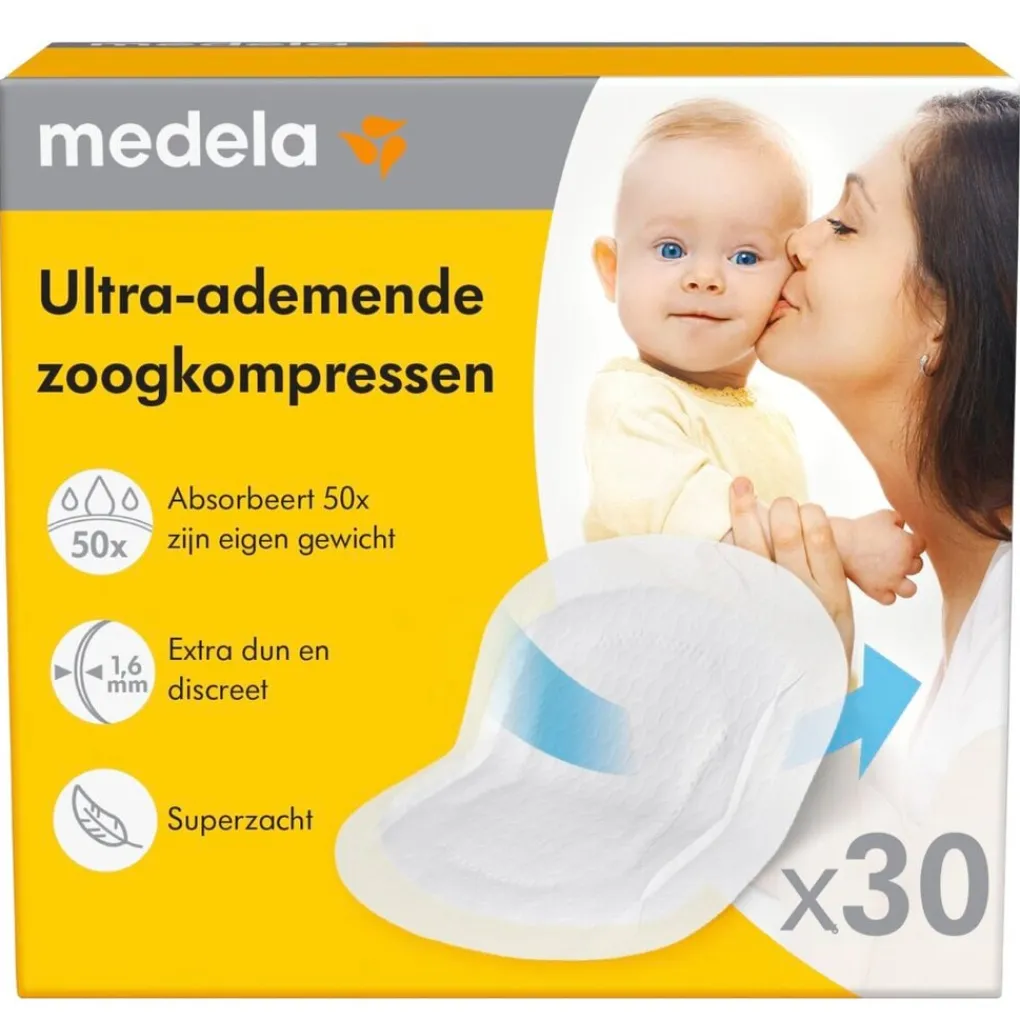 De Medela Ultra-Ademende Zoogkompressen hebben een polymeerkern bestaande uit drie lagen die vijftig keer hun gewicht absorberen. Zo zorgen deze zoogkompressen ervoor dat je dag en nacht droog blijft.