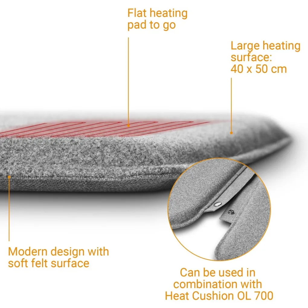 - Plat verwarmd zitkussen in compact formaat: 40 x 50 cm