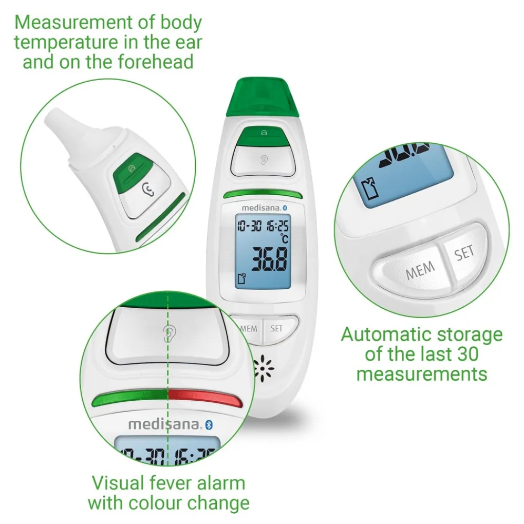 Met de TM 750 connect infraroodthermometer van Medisana kun je de lichaamstemperatuur nauwkeurig meten op het voorhoofd of in het oor. De multifunctionele thermometer geeft een geluidssignaal wanneer hij klaar is om te meten en wanneer de meting voltooid is.