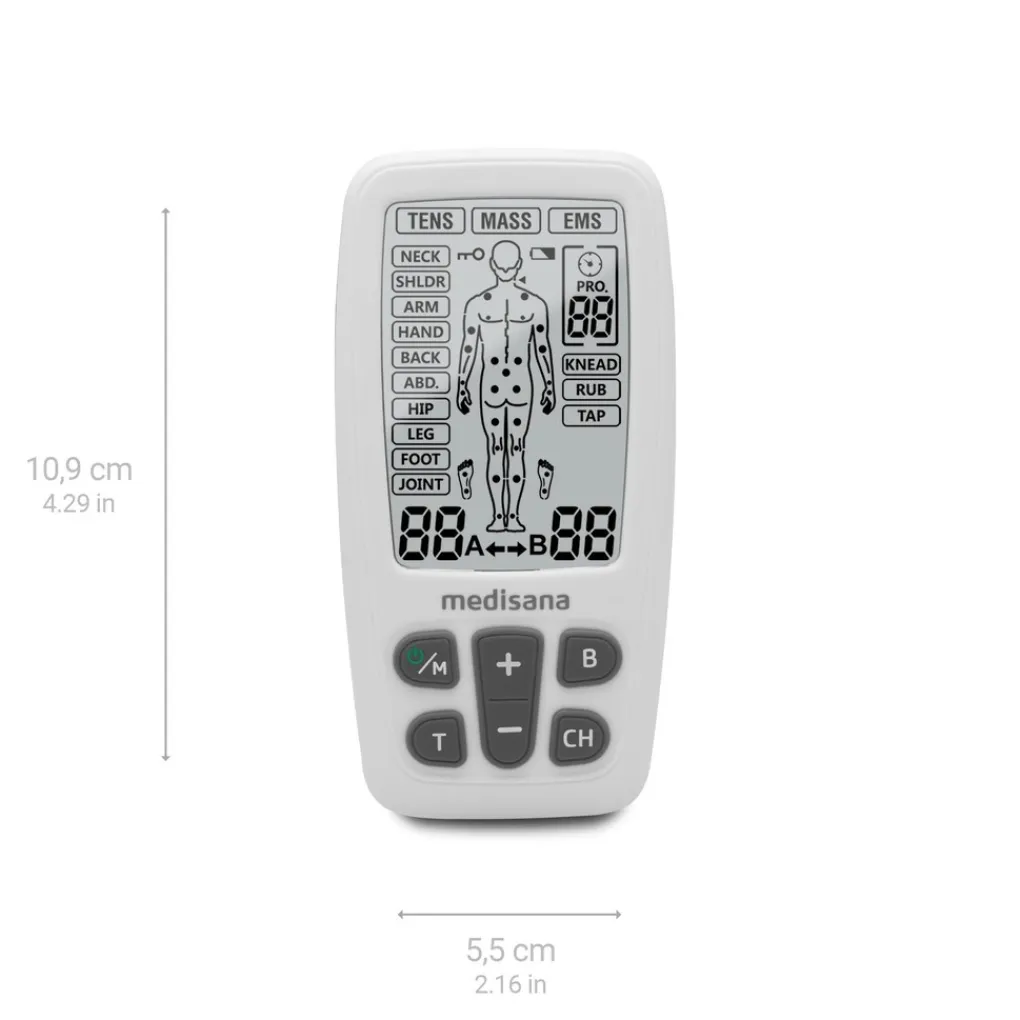 De TENS-therapie van het 3-in-1 elektrotherapieapparaat TT 200 van medisana is geschikt voor tien lichaamsdelen: Nek, schouder, arm, hand, rug, buik, heup, been, voet en gewricht. EMS-therapie is ontwikkeld voor negen lichaamsdelen: Nek, schouder, arm, hand, rug, buik, heup, been en voet. Er zijn in totaal 22 vooraf ingestelde TENS-, EMS- en massageprogramma’s beschikbaar.