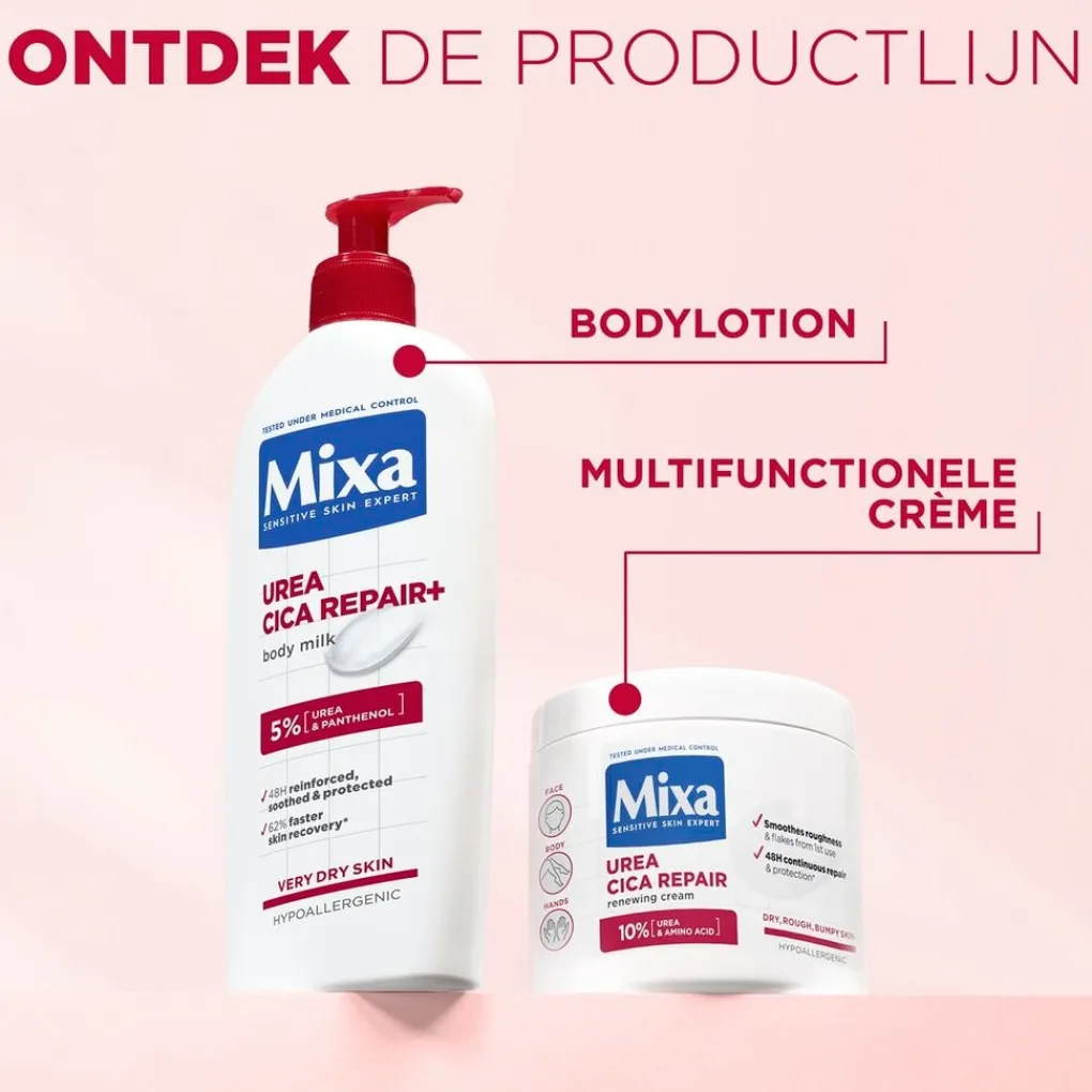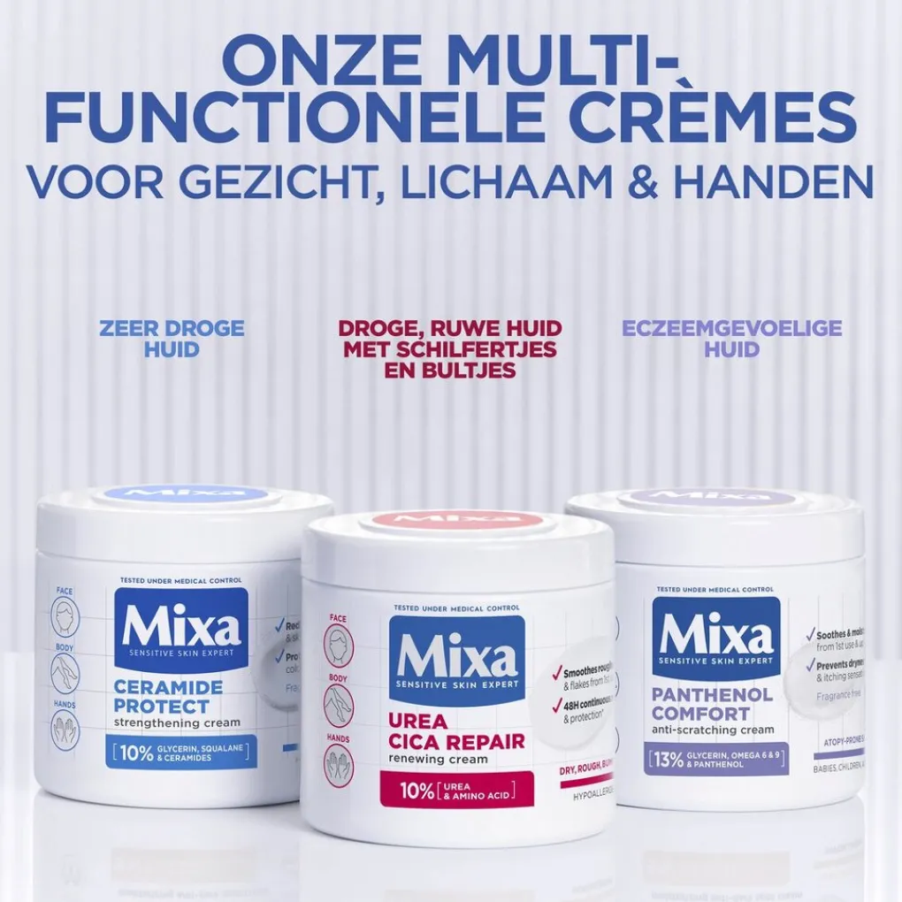 Al 100 jaar lang focust Mixa op het ontwikkelen van effectieve formules voor een gevoelige huid. Mixa producten zijn hypoallergeen geformuleerd en altijd getest onder medische controle. Zo weet Mixa zeker dat de crèmes geschikt zijn voor een gevoelige huid. Dit geldt ook voor de Mixa Urea Cica Repair+ Herstelondersteunende Crème, die je gebruikt als gezichtscrème, bodylotion én handcrème. De 3-in-1 crème trekt snel in, heeft een niet vette textuur en is geschikt voor dagelijks gebruik.