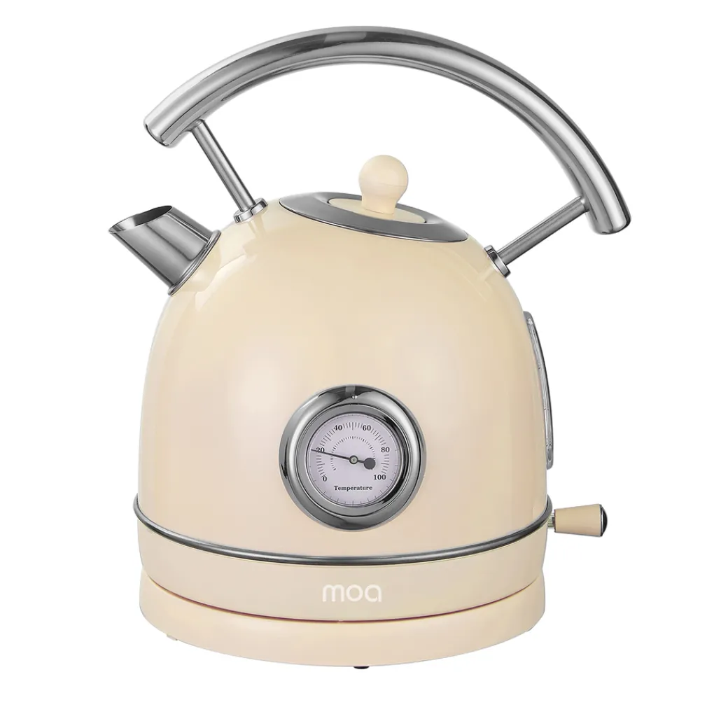 De retro waterkoker EK4TC van het merk MOA is een echte blikvanger. De waterkoker ziet er uit als een ouderwetse fluitketel en is gemaakt van roestvrij staal. Het geeft het product een stijlvolle en retro-look. De retro-look wordt gecombineerd met een handige, ingebouwde thermometer. Hiermee zie je in één oogopslag hoeveel graden Celsius het water is. Ideaal als je je water niet helemaal kokend wilt hebben. Een groene thee komt bijvoorbeeld beter tot zijn recht als deze bereid wordt met water dat 70 tot 75 graden Celsius warm is.