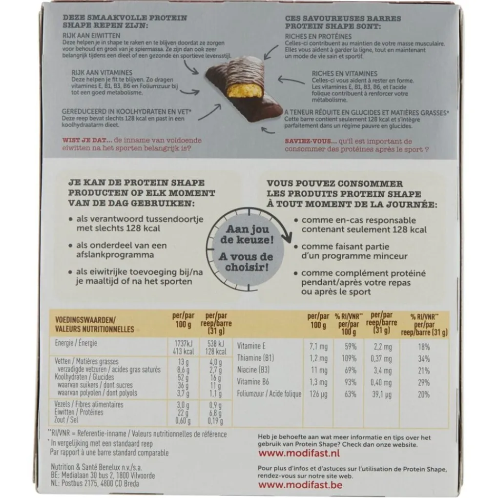 Modifast Protein Shape Pure & Witte Chocolade Snackreep is een tussendoortje met een heerlijke, witte chocoladesmaak en een laagje, lekkere, pure chocolade.