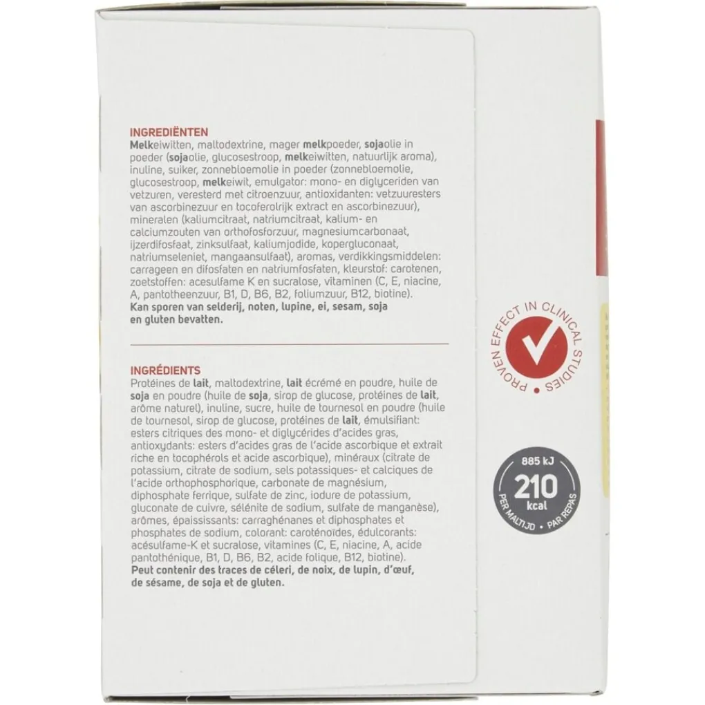Ingrediënten: Magere MELKpoeder, volledig geraffineerde sojaolie, MELKeiwitten, TARWE-eiwitten, verdikkingsmiddelen (guargom, xanthaangom), smaakstoffen (MELK), glucosestroop, mineralen (kalium, magnesium, ijzer, zink, koper, mangaan, molybdeen, jodium, selenium), MELKpoederconcentraat, cichoreivezels: inuline, choline, zoetstoffen (acesulfaam-K, sucralose), kleurstof: carotenoïden, vitamines (C, E, niacine, A, pantotheenzuur, D, B6, B12, K, thiamine, riboflavine, foliumzuur, biotine)